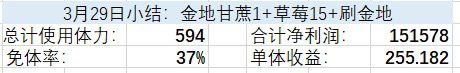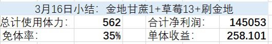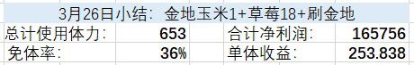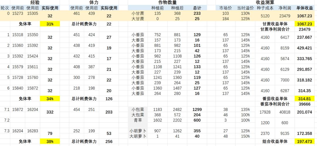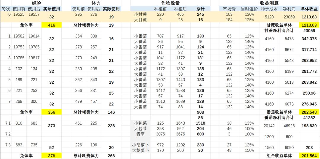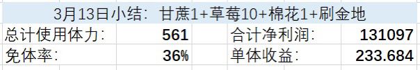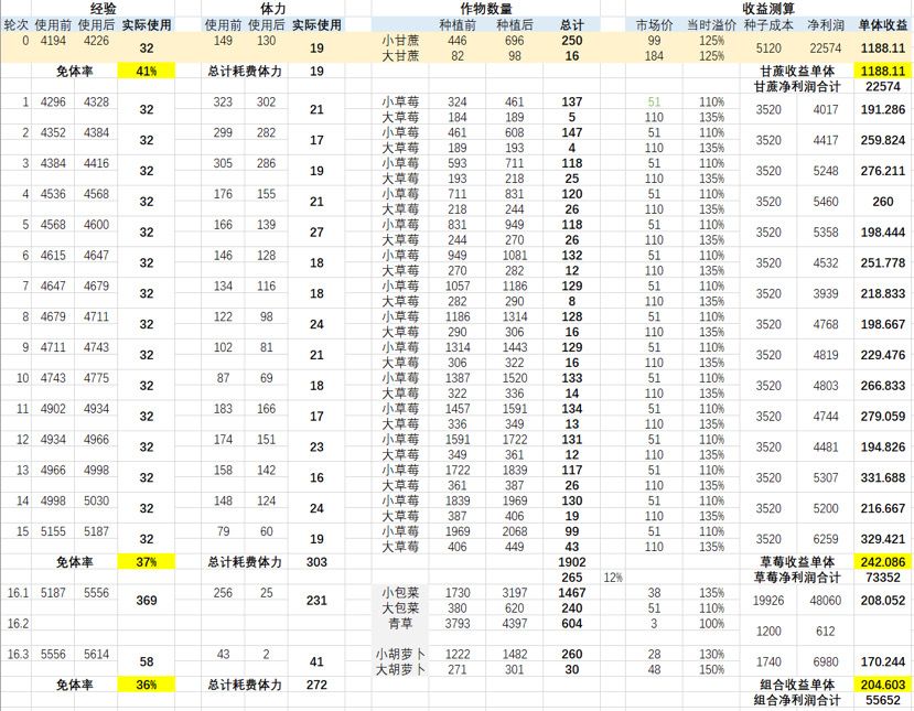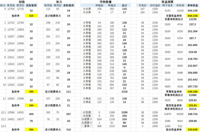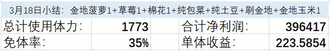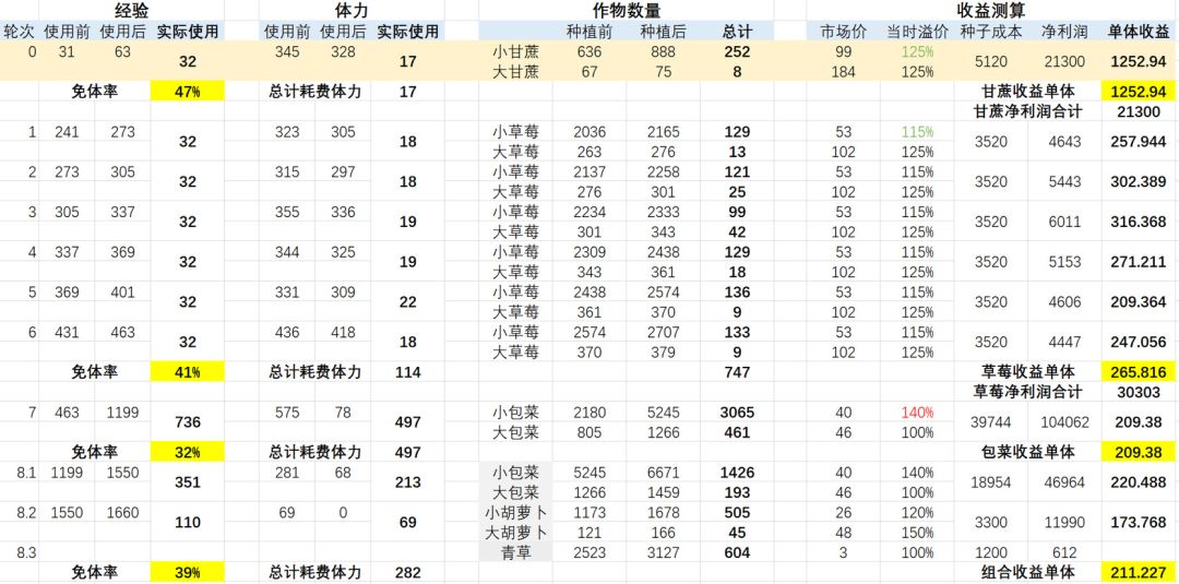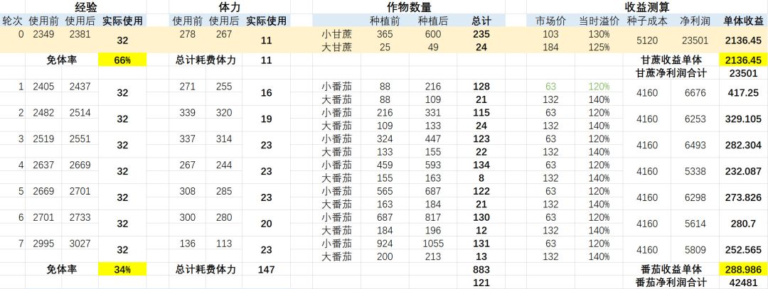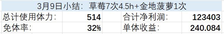 四个半小时种了7波草莓,平均单体收益为254,总计耗费体力145,免体率为35%。草莓的研究只有减cd点到9级,其余为0。
