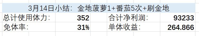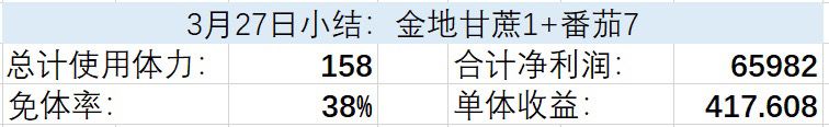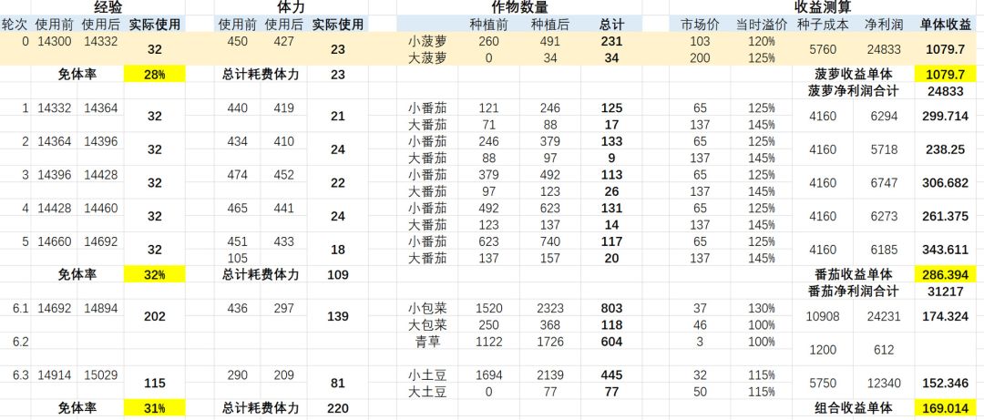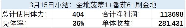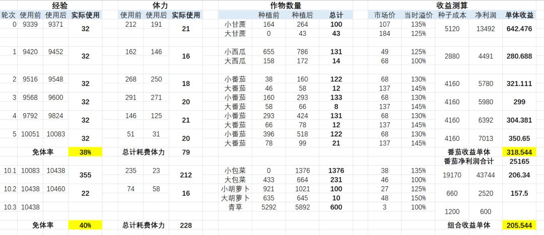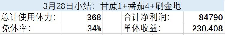 今天没刷金地,因为点了包菜额外获得的一级研究,所以想试试收益如何。推了6000个包菜,用了879体力,单体收益到了207,免体36%。