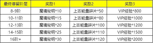 活动内容:每日通关指定次数的单人魔境即可领取宝石包(2级)、魔境秘钥、上古能量碎片奖励,每日凌晨5:00重置;
