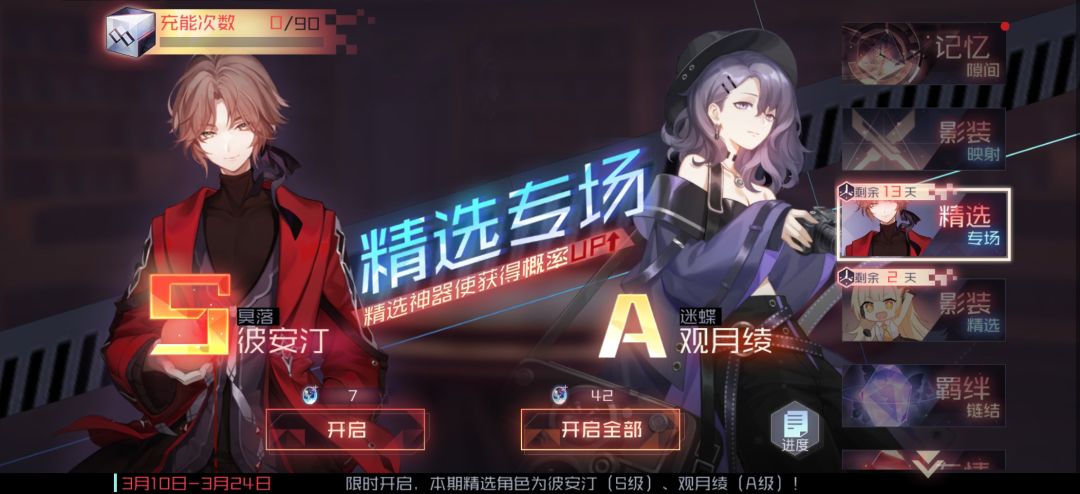 3月10日维护后至3月24日早7:00:彼安汀(S级)、观月绫(A级)概率UP