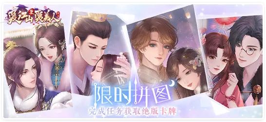 ※ 活动期间,参与白色情人节「限时拼图」,完成每张卡牌拼图横向及竖向的各3个任务,即可领取四位蓝颜的甜蜜专属卡牌:阿里衮 · 南国相思、弘历 · 时光缱绻、艾兰迪 · 尘寰戏梦、齐墨 · 暮雪天久。快来收集卡牌解锁属于你与TA的甜蜜时光吧!