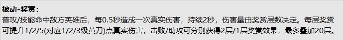 被动-赏金和其他打野刀的被动-磨砺均更名为被动-奖赏,与此同时我们将移除被动-狩猎中对英雄的真实伤害,其中“黄刀”的被动-奖赏效果为: