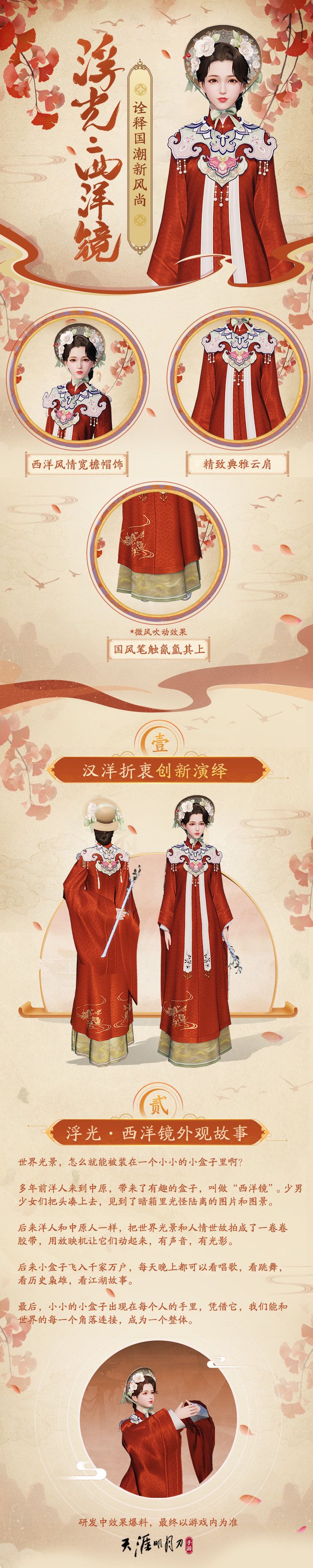 当西洋风情宽檐帽饰遇上古典云肩,男装腰缀环佩,女装云肩在披。裙摆处国风笔触氤氲其上,【浮光·西洋镜】这波细节拉满!