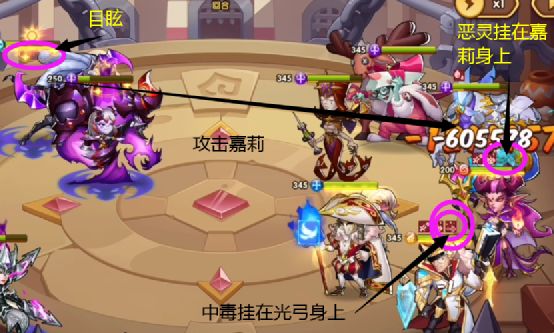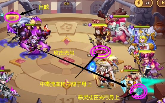 同样是针对受击单位的生命上限12%伤害跟普攻一起被闪避了,为什么嗜血效果却打出来了?大家有没有注意到此时光战头上的东西?光战此时正处于目眩状态,目眩是“光弓”拉塞尔的特色,可以将目标的攻击目标强制变成随机1人,