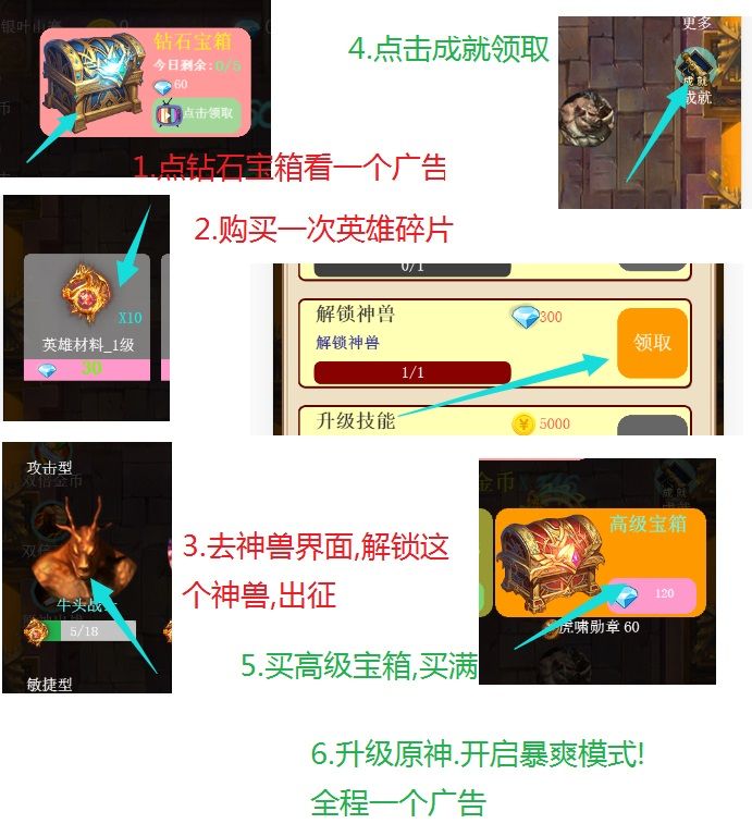 打开游戏后,去商店看一个宝箱广告,获取钻石后,直接购买神兽碎片,出战英雄,重复上边的刷刷刷