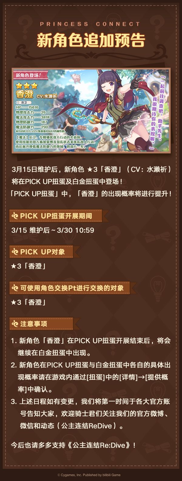更新结束后,新角色★3「香澄」(CV:水濑祈)即将登场!游戏内将同时开启「香澄」 PICK UP扭蛋活动;同时,还将追加新的角色专用装备;开放地下城「毒瘴的暗棱(极限Ⅱ)」!