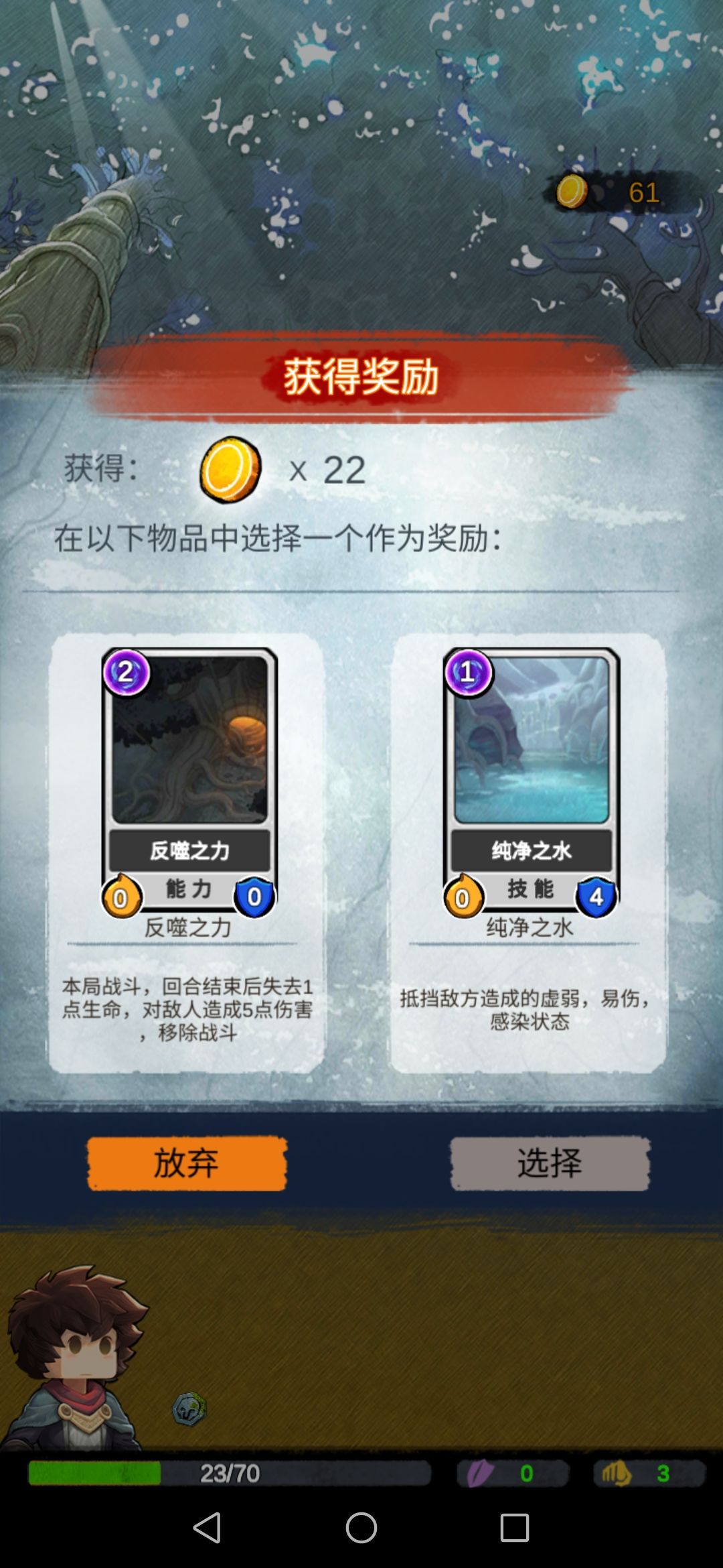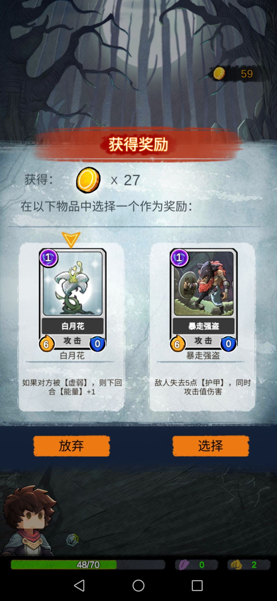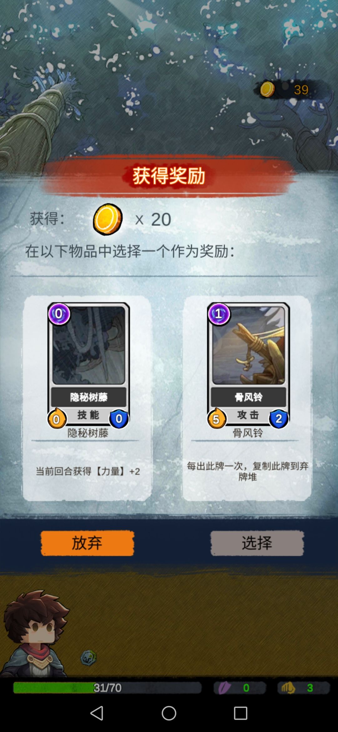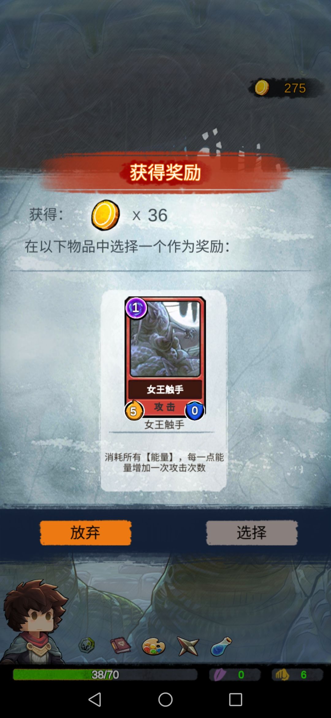 然后我们碰到boss,此时的我们每一张攻击牌对于它来说都是巨大伤害,boss没撑过第二回合…奖励选择放弃。