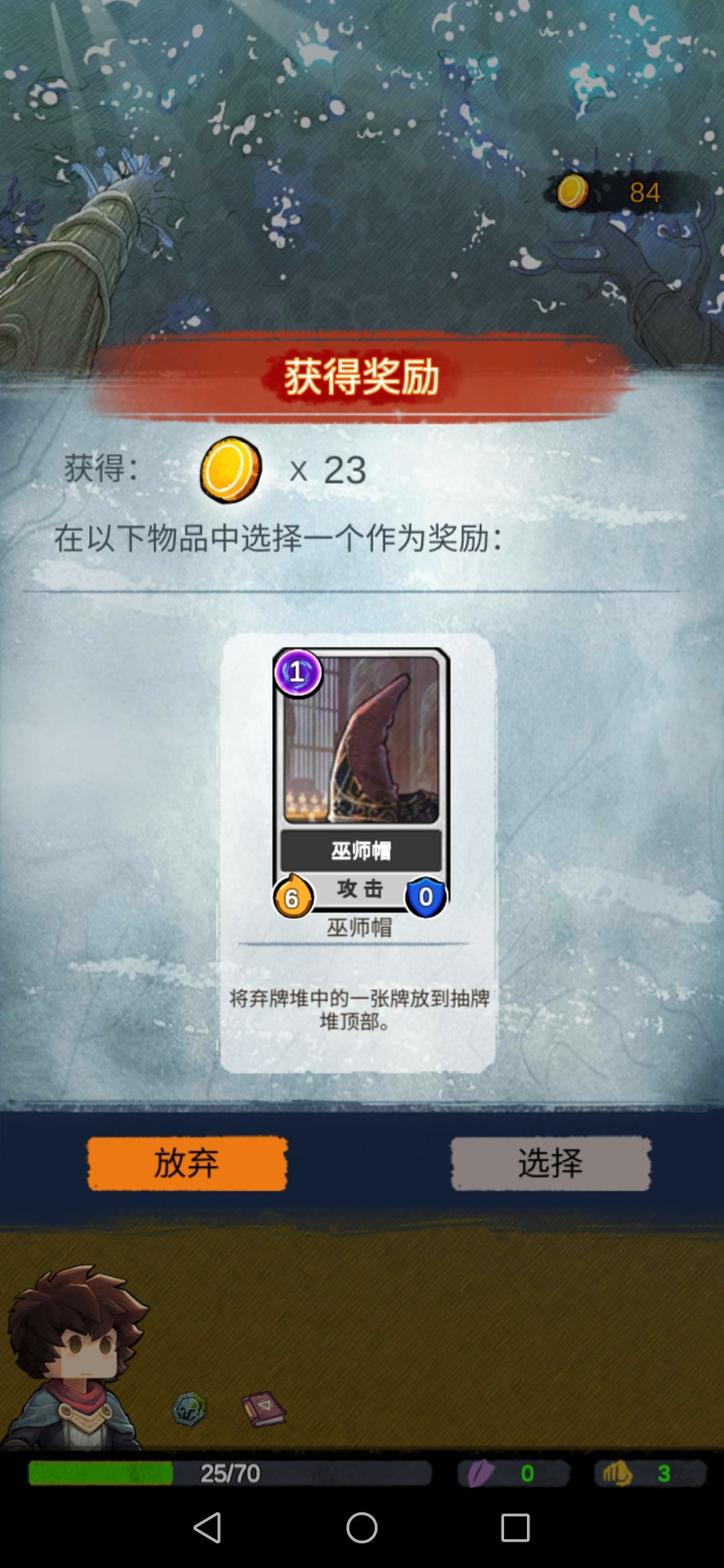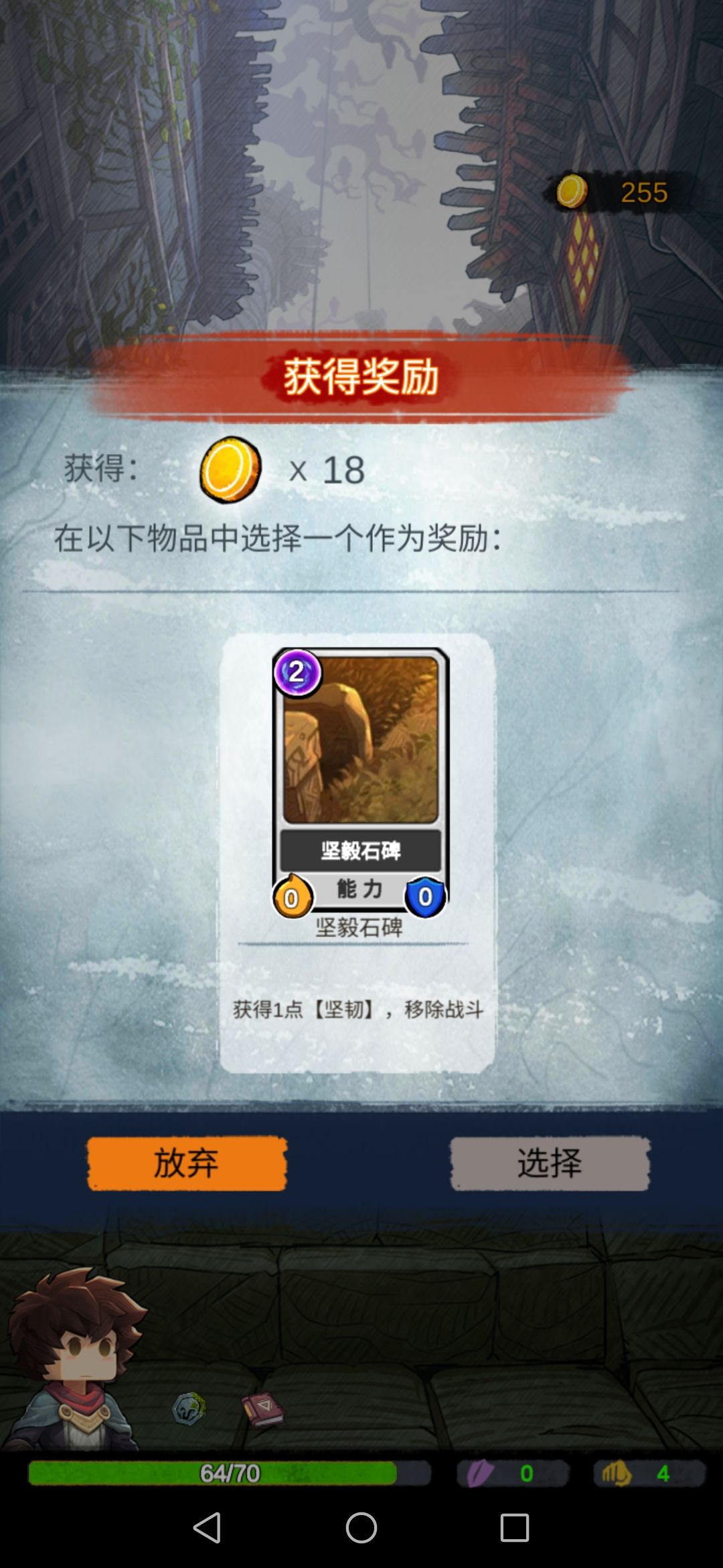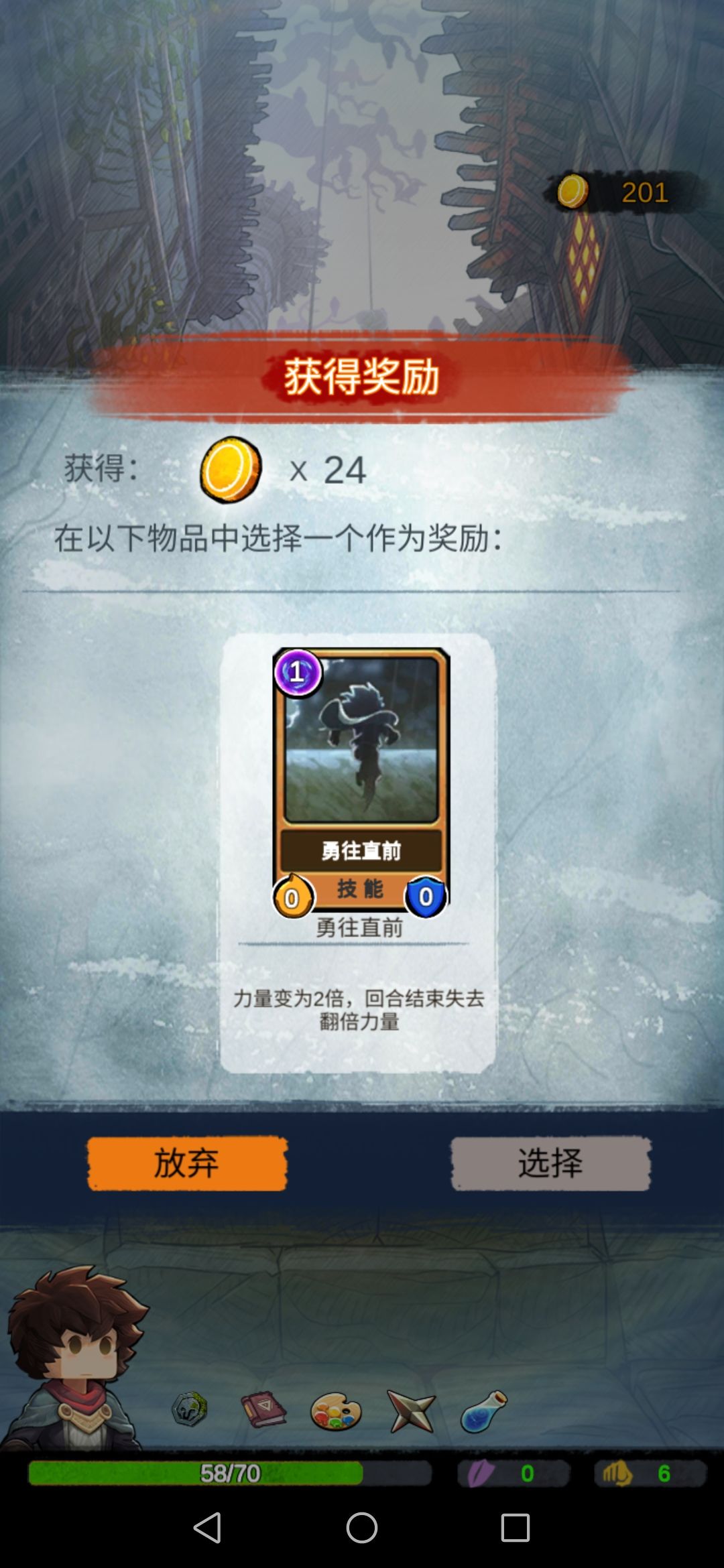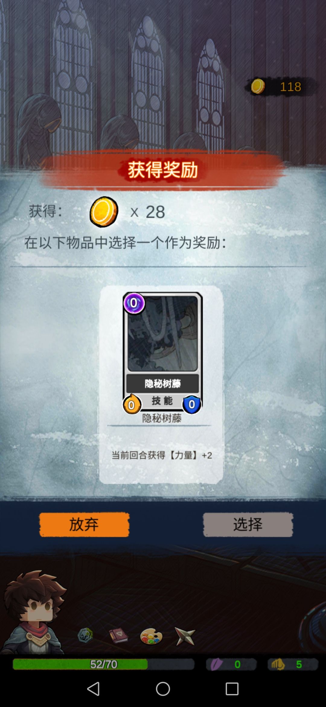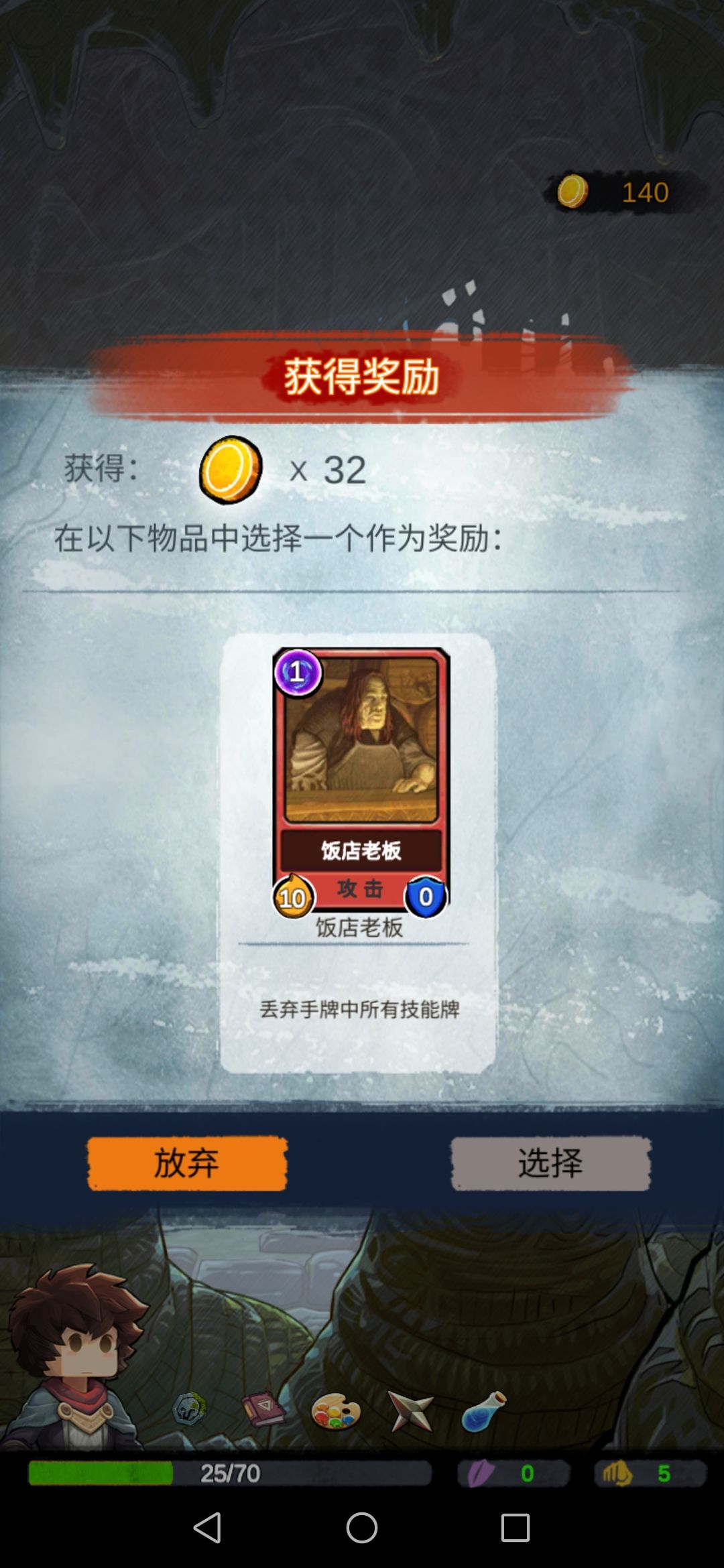 然后我们碰到boss,此时的我们每一张攻击牌对于它来说都是巨大伤害,boss没撑过第二回合…奖励选择放弃。