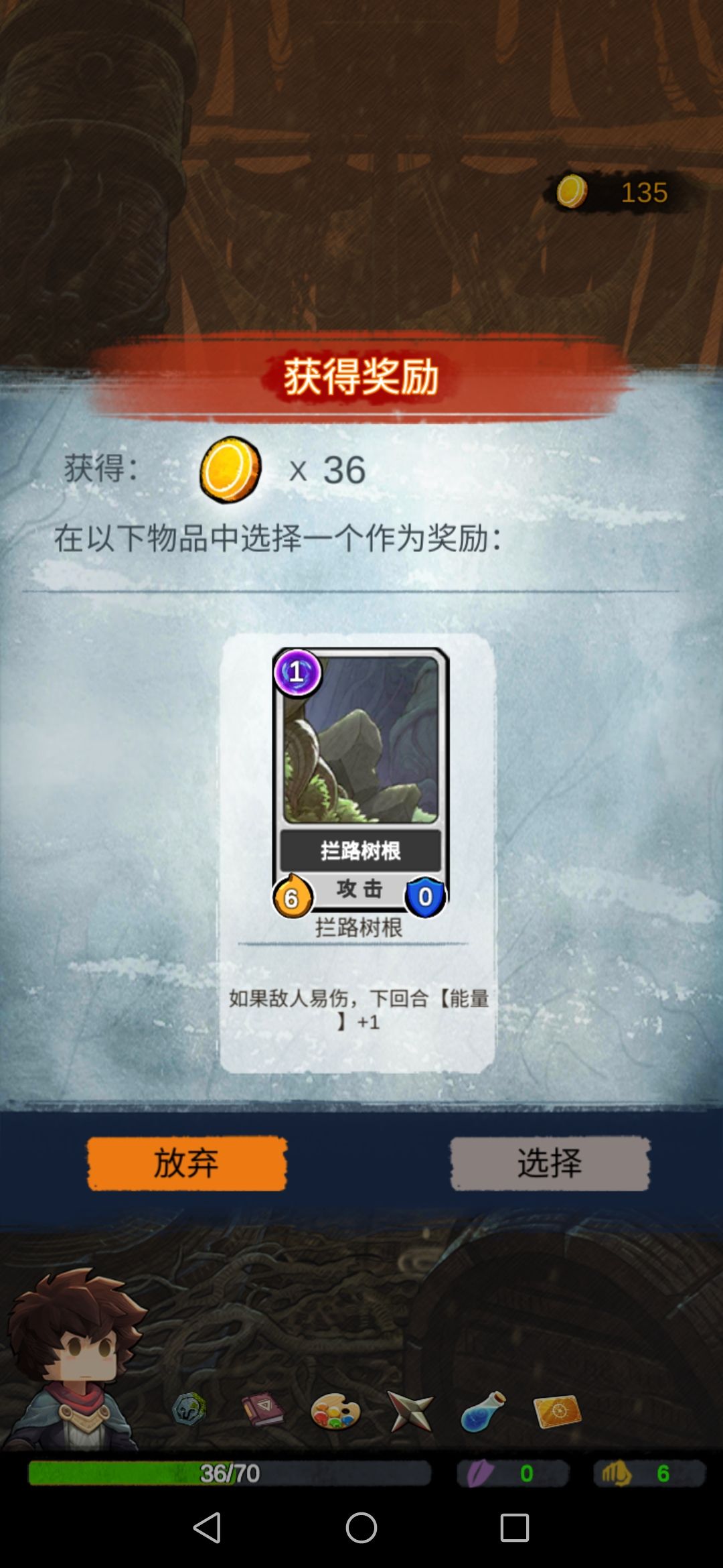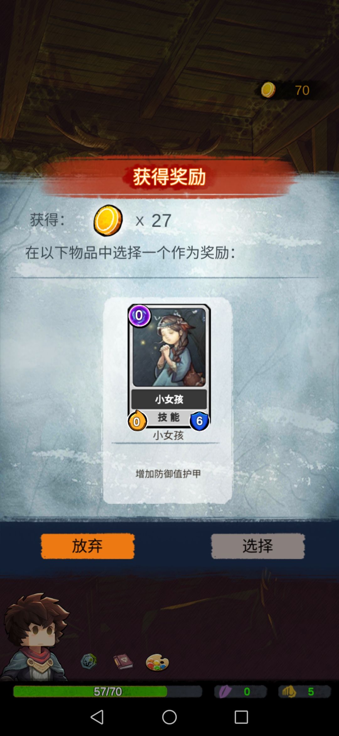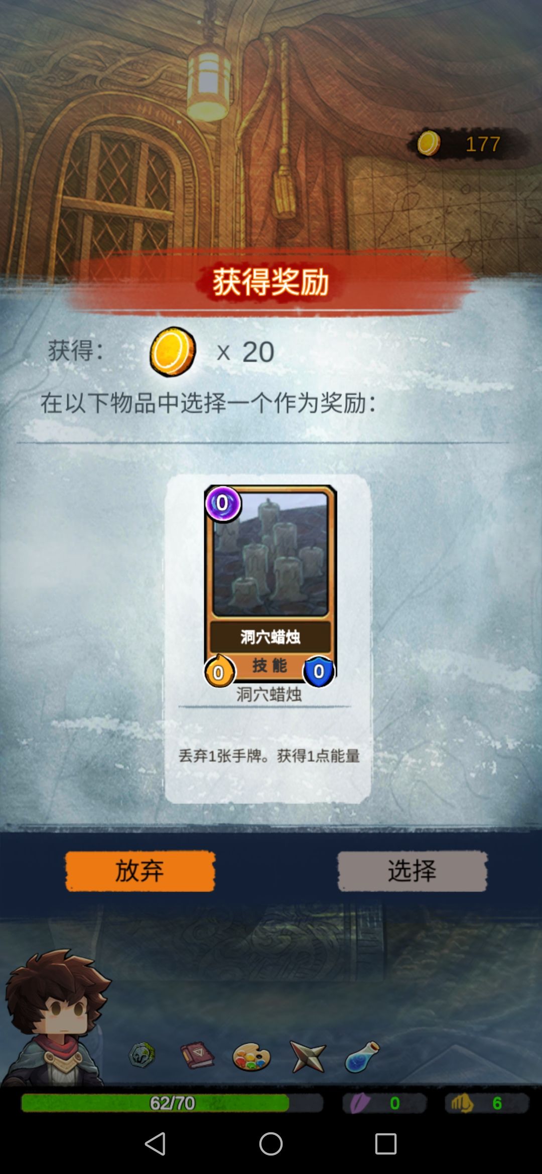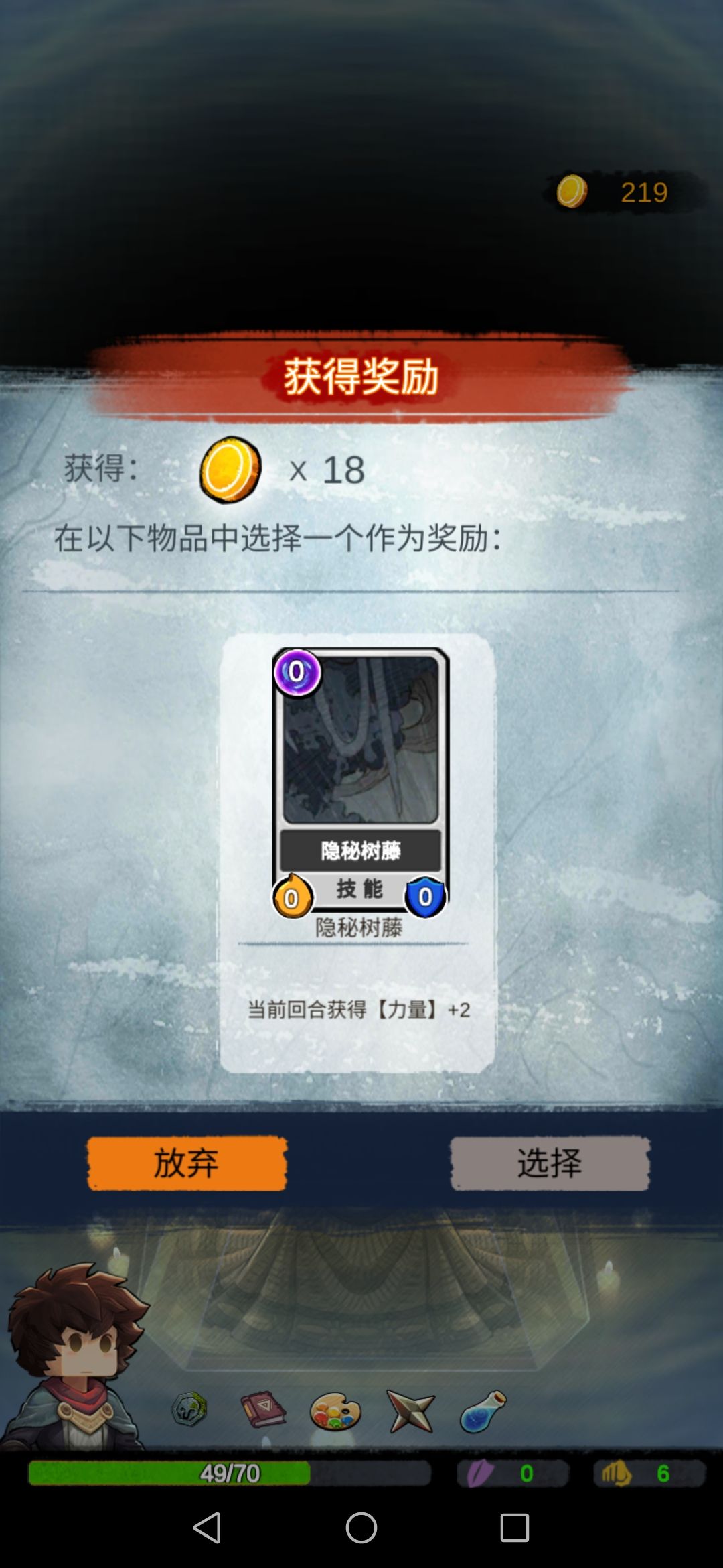 然后我们碰到boss,此时的我们每一张攻击牌对于它来说都是巨大伤害,boss没撑过第二回合…奖励选择放弃。