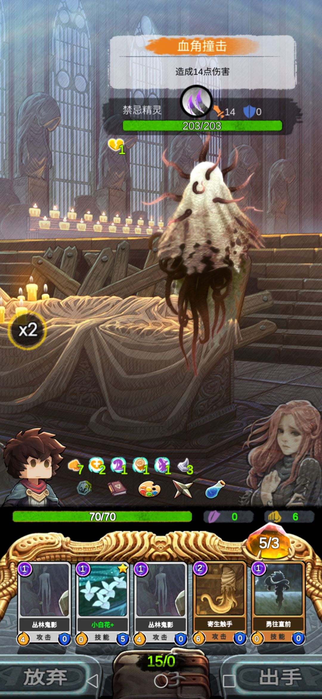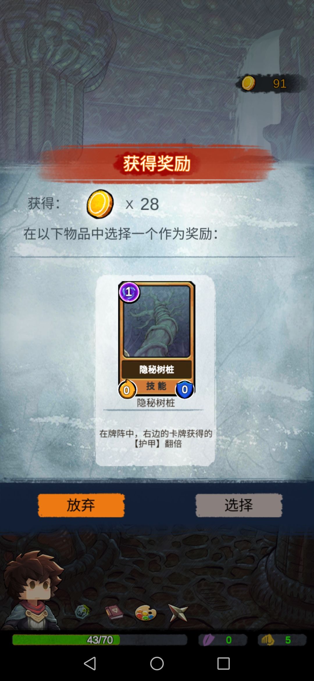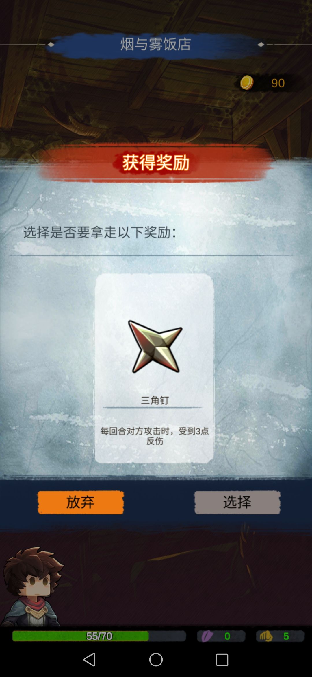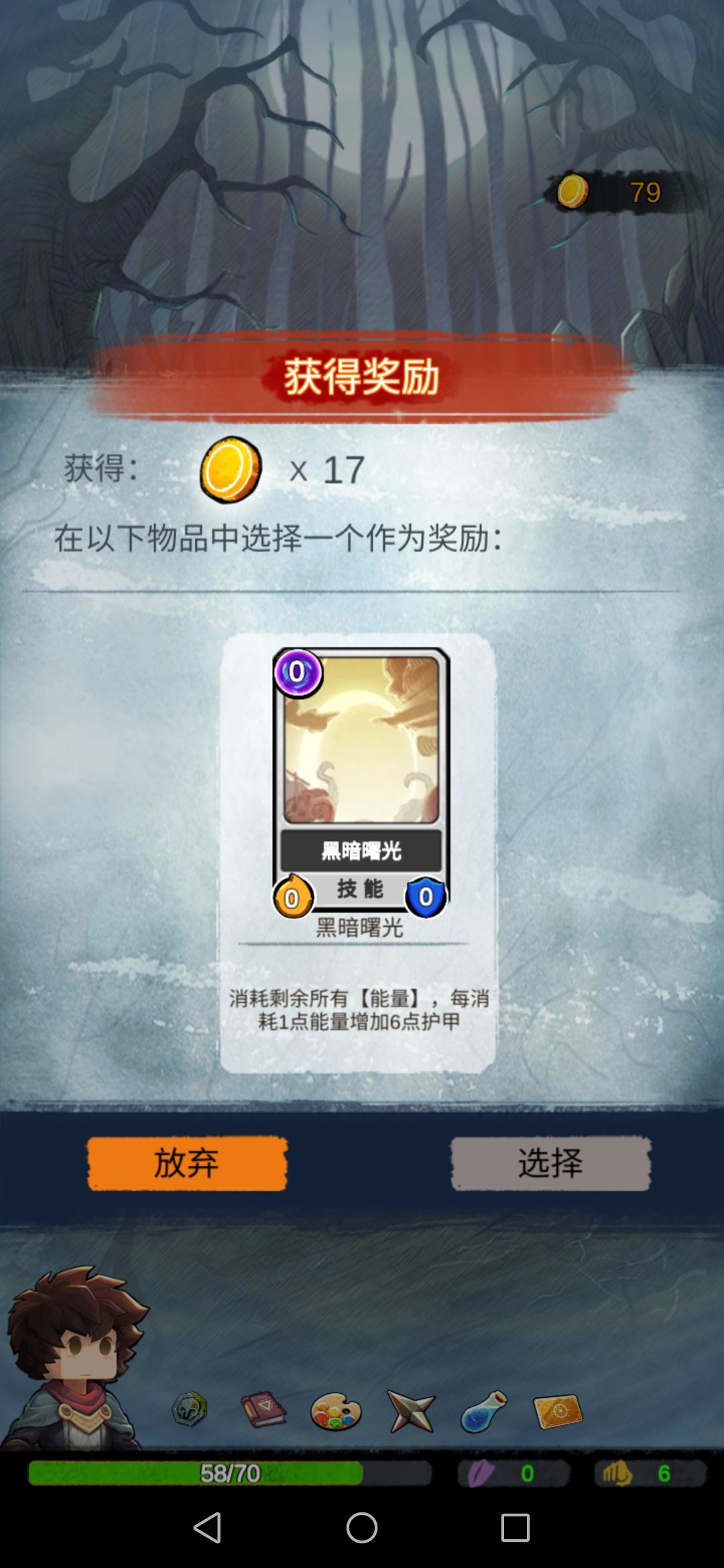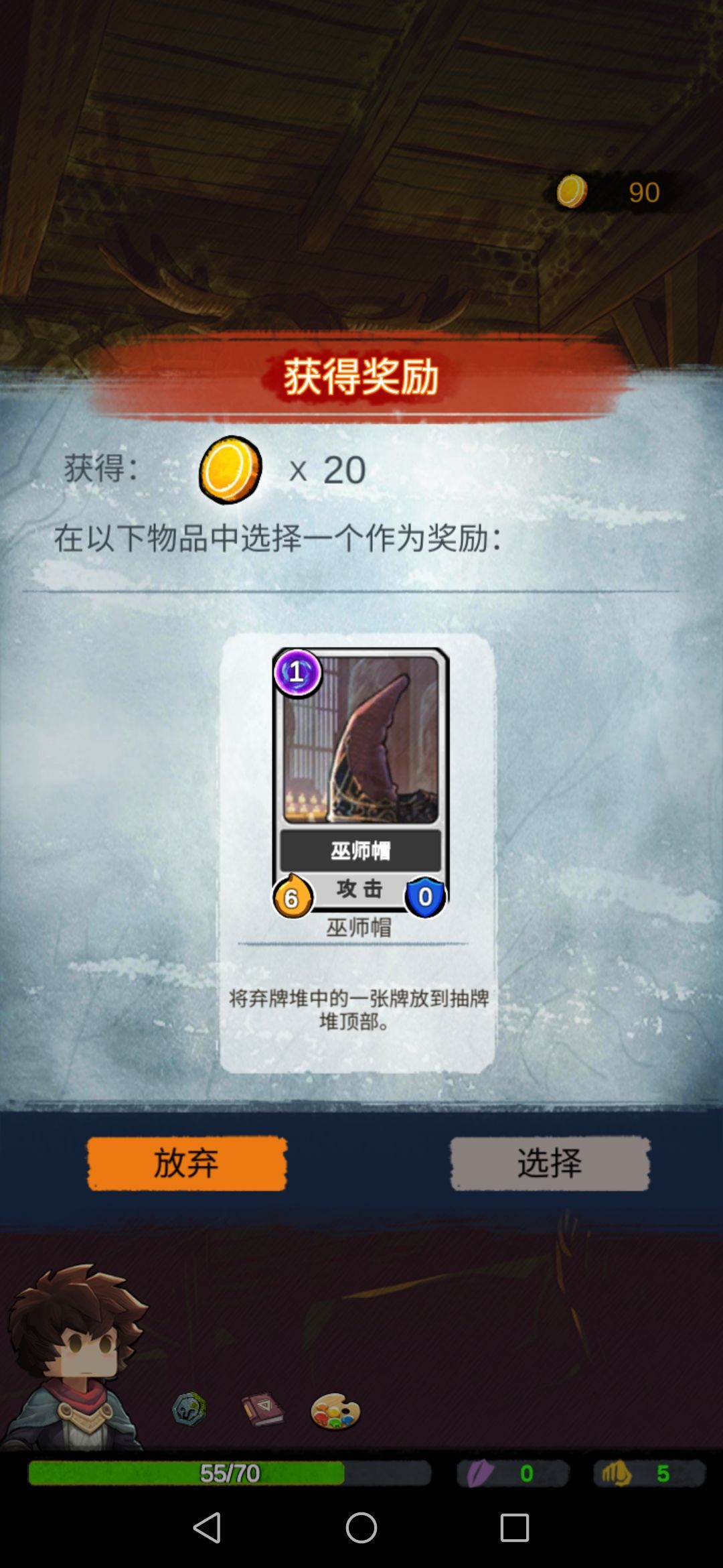 然后我们碰到boss,此时的我们每一张攻击牌对于它来说都是巨大伤害,boss没撑过第二回合…奖励选择放弃。