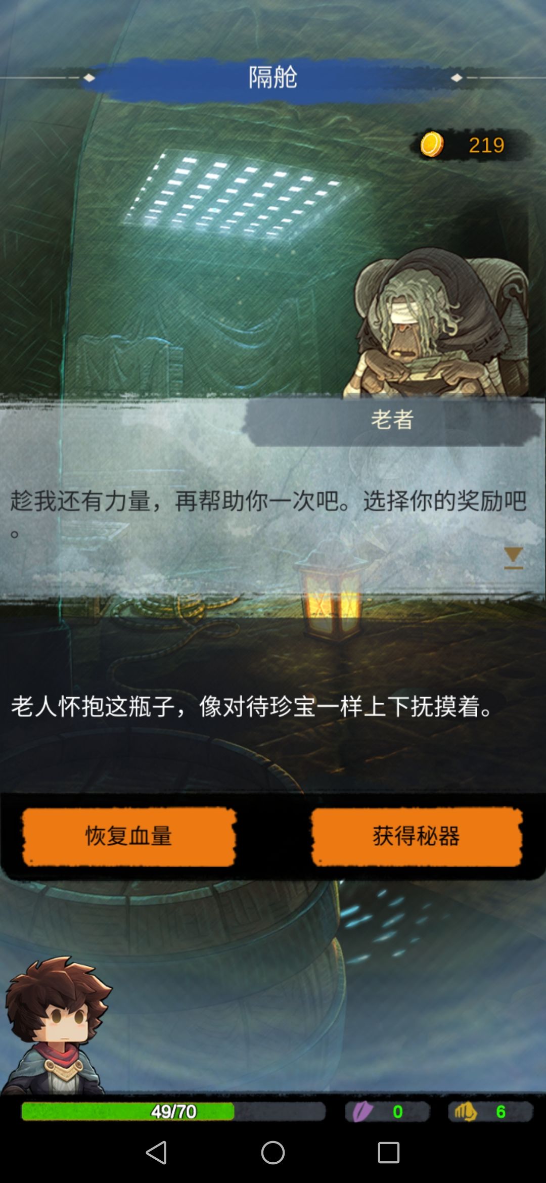 击败后拿到一对眼珠,是老者的。我们回隔舱,给老者,这时要血量。(后面的怪物伤害非常高,而我们通常第二回合才能干掉他们,就意味着我们要吃一回合伤害,车轮战吃不消的。)