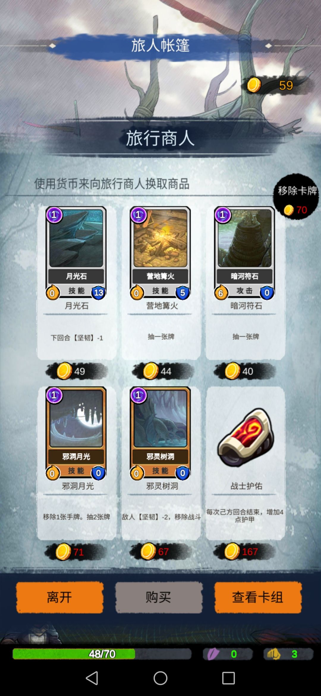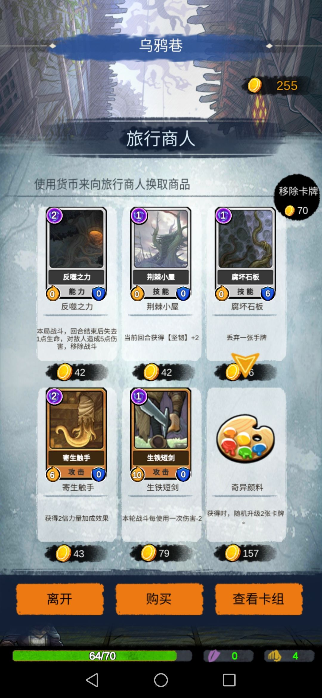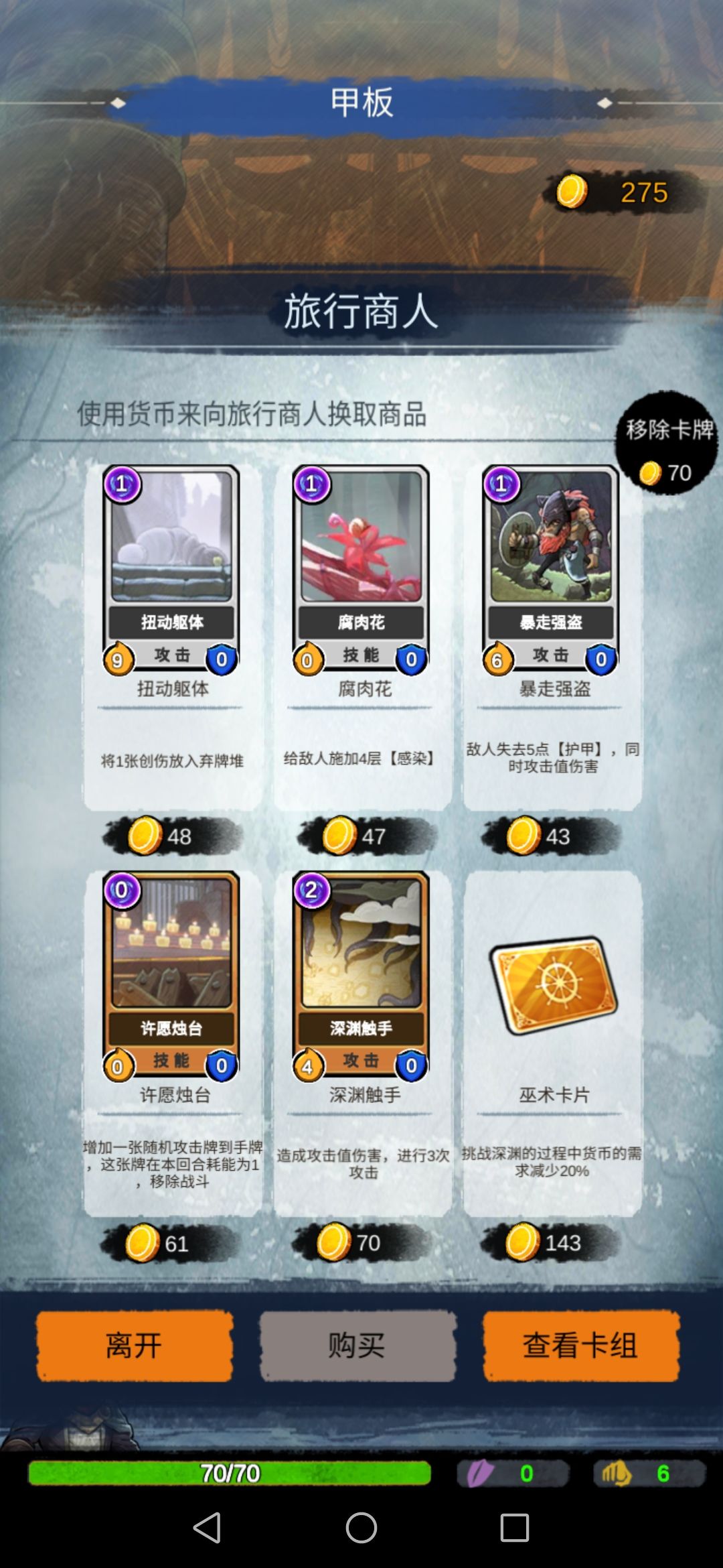 然后来到甲板,商店可以选择深渊触手和移除卡牌。(有需要可以选择巫术卡片,玩噩梦需要,我就买了巫术卡片)