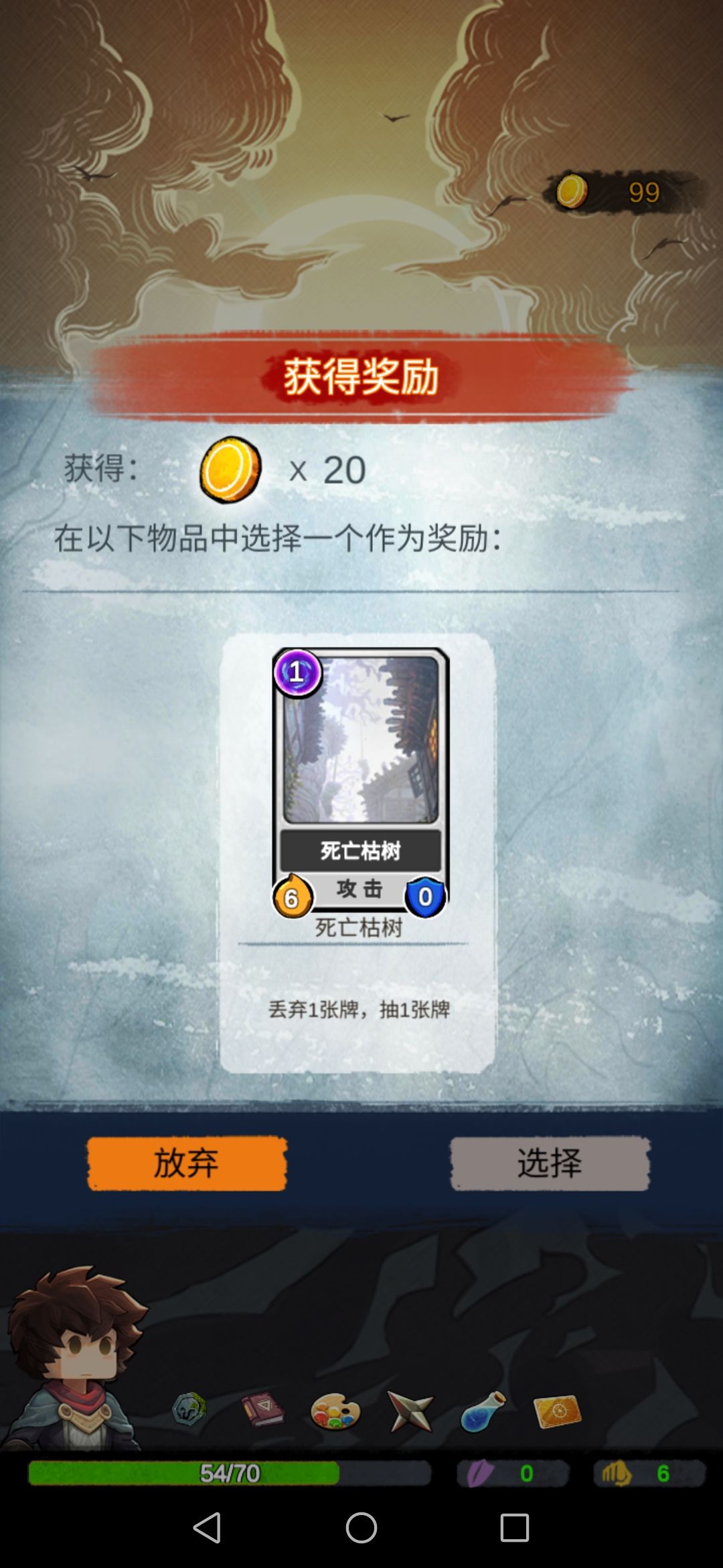 得到经书2,回街角给老者,继续升级卡牌,我们选择死亡枯树,战斗的时候注意排序等于白嫖两张,还可以丢弃之前的诅咒牌,四舍五入等于血赚