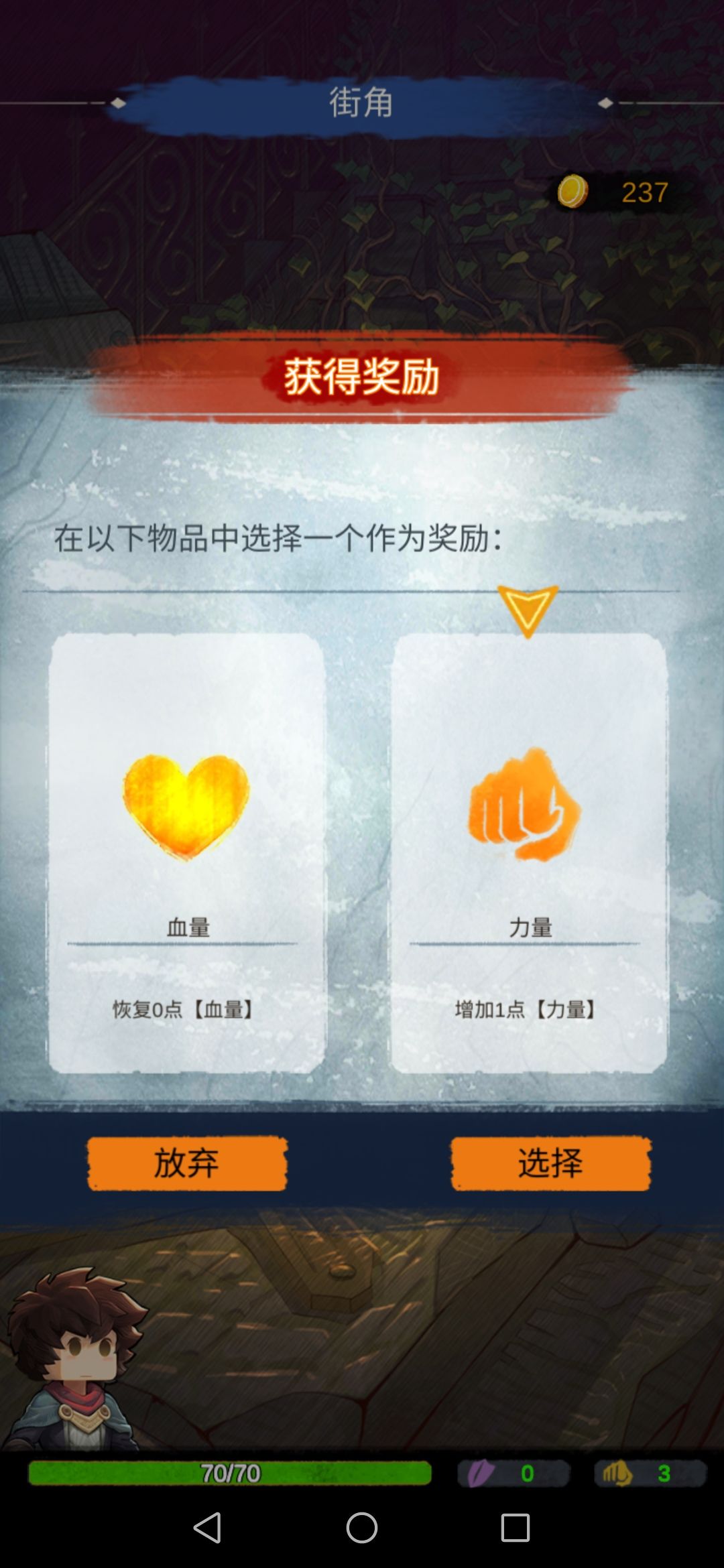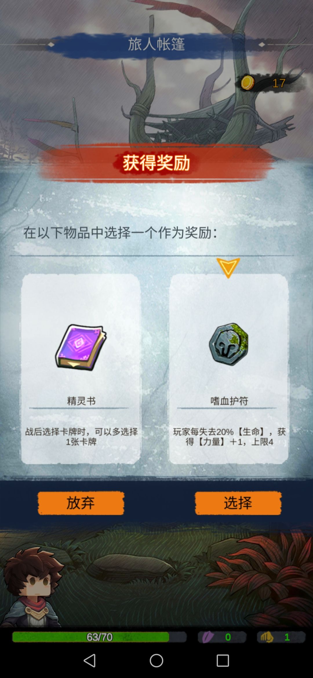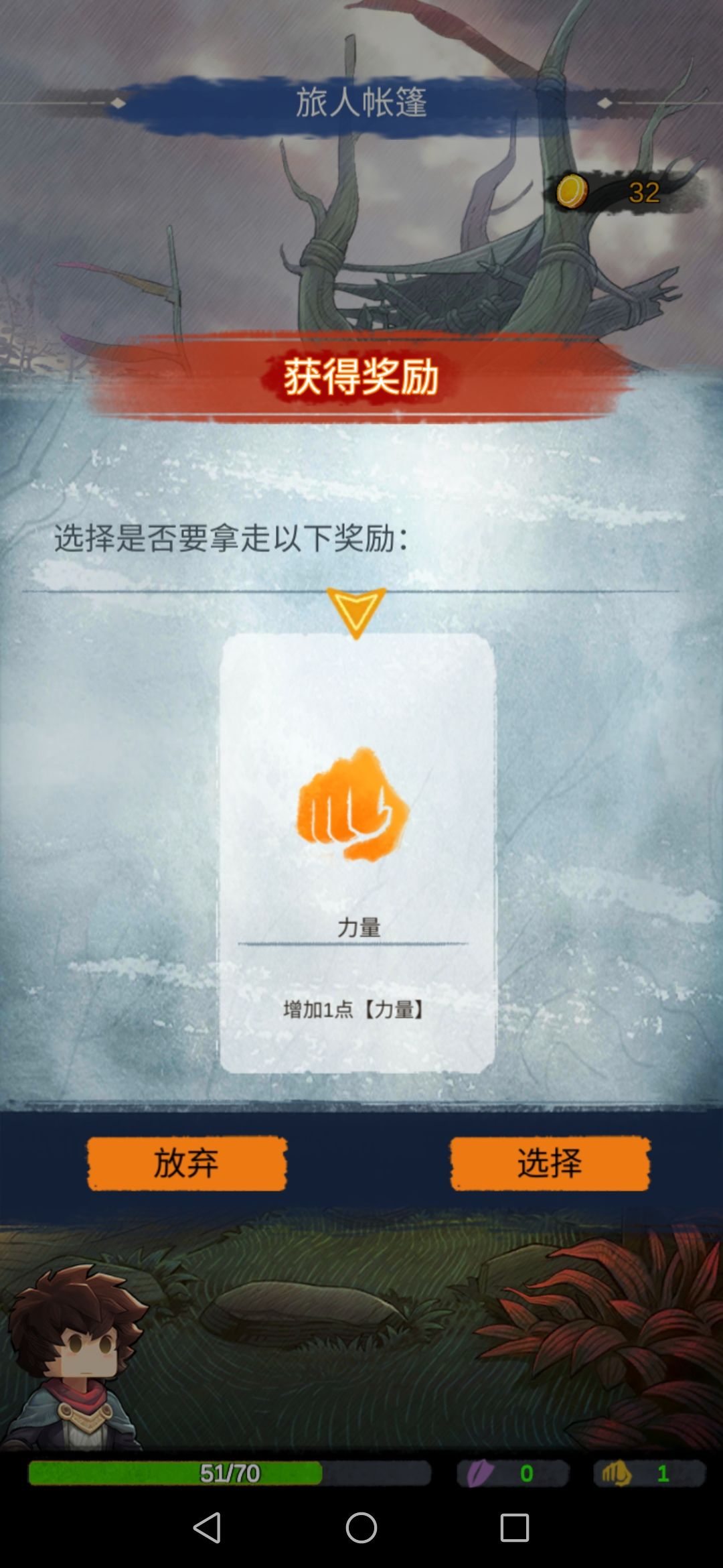 然后我们去旅人帐篷,会随机给两个道具。我们选择第二个,此时的力量流派就有了雏形。