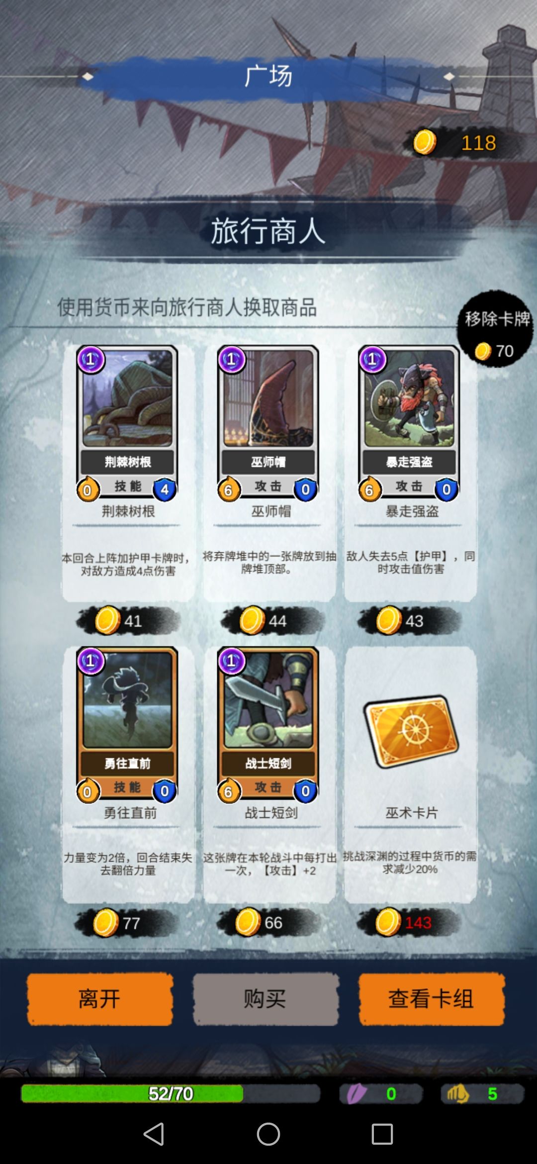 回到广场,进入商店,金币不太够了,选择移除卡牌,移除叠甲
