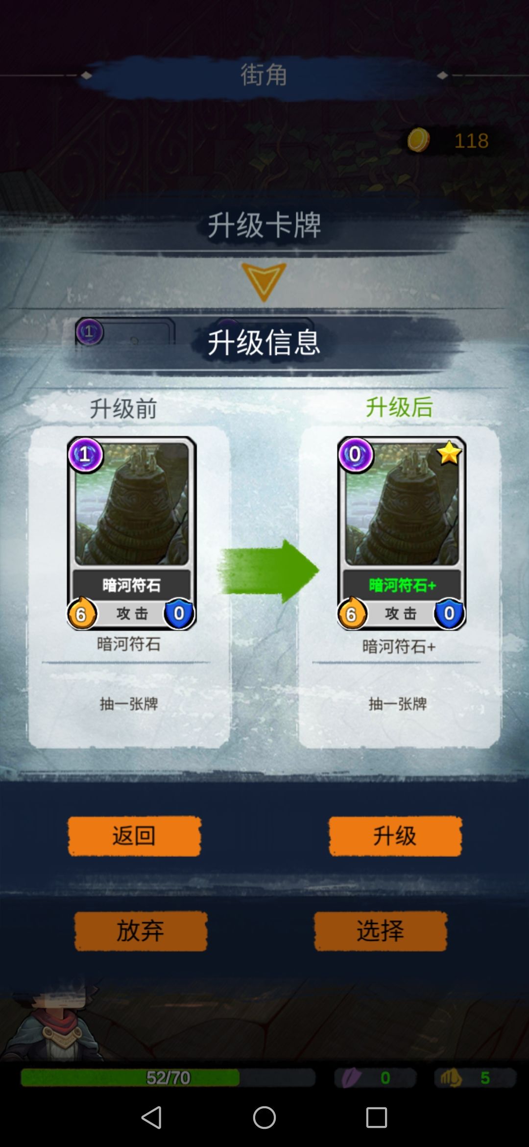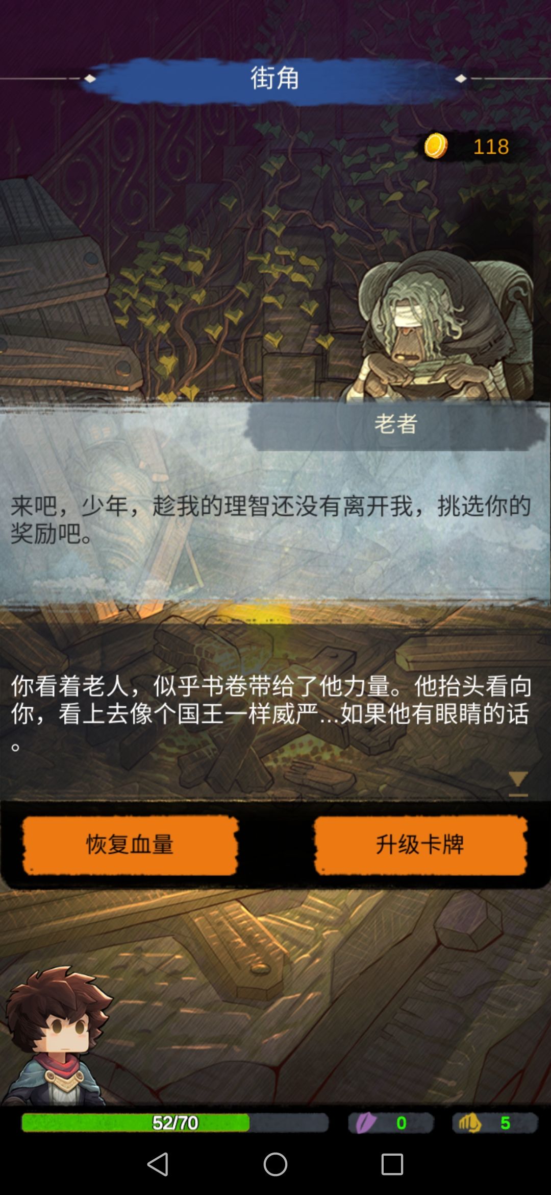 拿到经书,回街角,给老者,选择升级卡牌