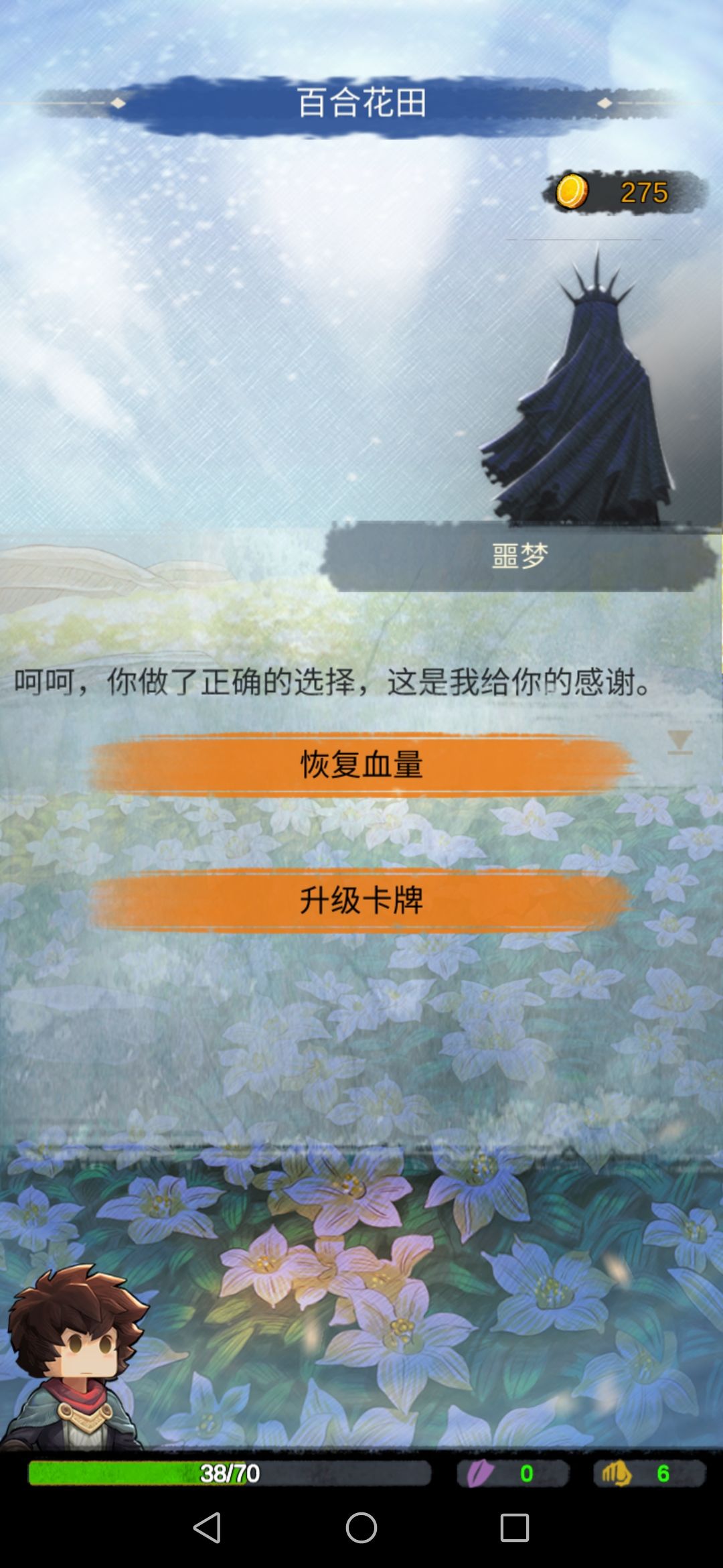 通过几段剧情后,我们发现原来老者是国王,年轻时,为了国家和力量老者迷失了自我,最后帮助了我们,我们得已进入了百合花田。花田里是船长老婆和年轻的船长,剧情后船长带我们出来。我们再次进入花田,碰到好梦噩梦在争执,我们去从船长老婆那里拿一朵花给噩梦(给好梦获得属性,大后期了属性不是很关键,已经定型了。)选择回复血量。