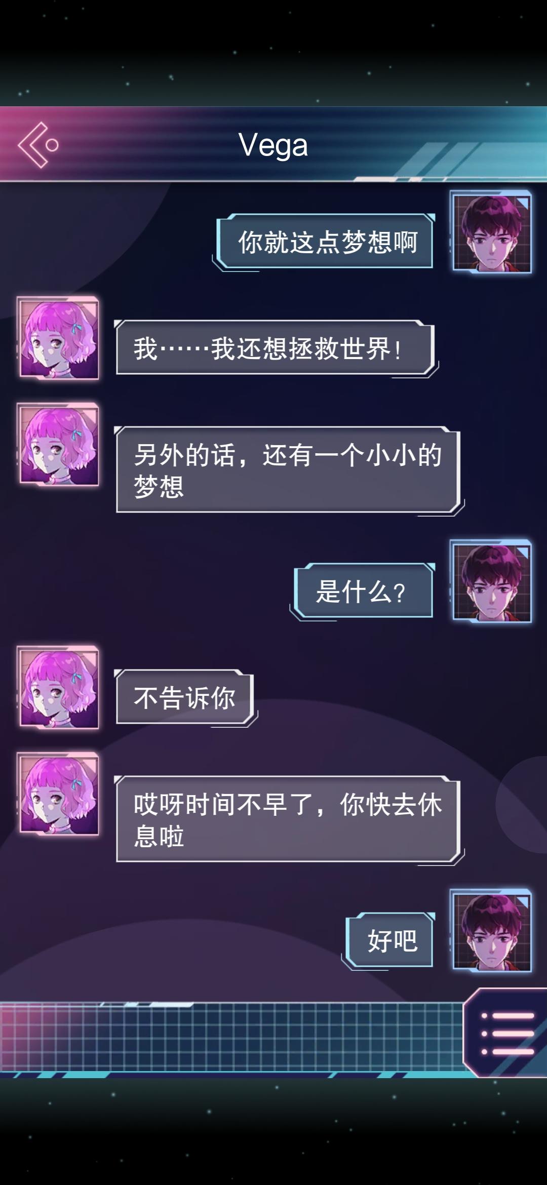 大概花了两天吧,才陆陆续续全结局,第一次打出了独行,然后第二个是永恒守护,然后昨天晚上打出了云端之约和执子之手,然后就不敢打了,不过强迫症的我忍痛打出来剩下的结局😭Vega,我的Vega😭😭年纪大了,玩游戏都泪目看到跟Vega的聊天记录一下就绷不住了,呜呜呜