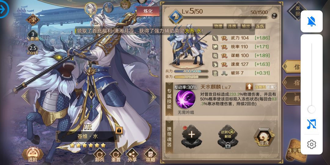 喜欢姜维的原因也简单啦,充值就送直接拉上队伍开荒谁又不喜欢呢,同时又因为技能的概率原因偶尔会当演员,但是哦,姜维后期的话
