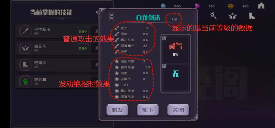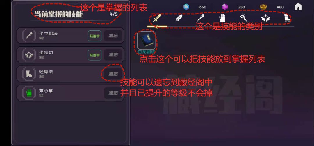 玩家获取到某个技能后,这个技能是储存在“藏经阁”中的,需要装备到“掌握列表”才起作用。