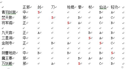 从这个表格可以看出,没有任何门派是完美的。换而言之,玩家需要到数个门派收集技能,从而组合和搭配出完美的角色。