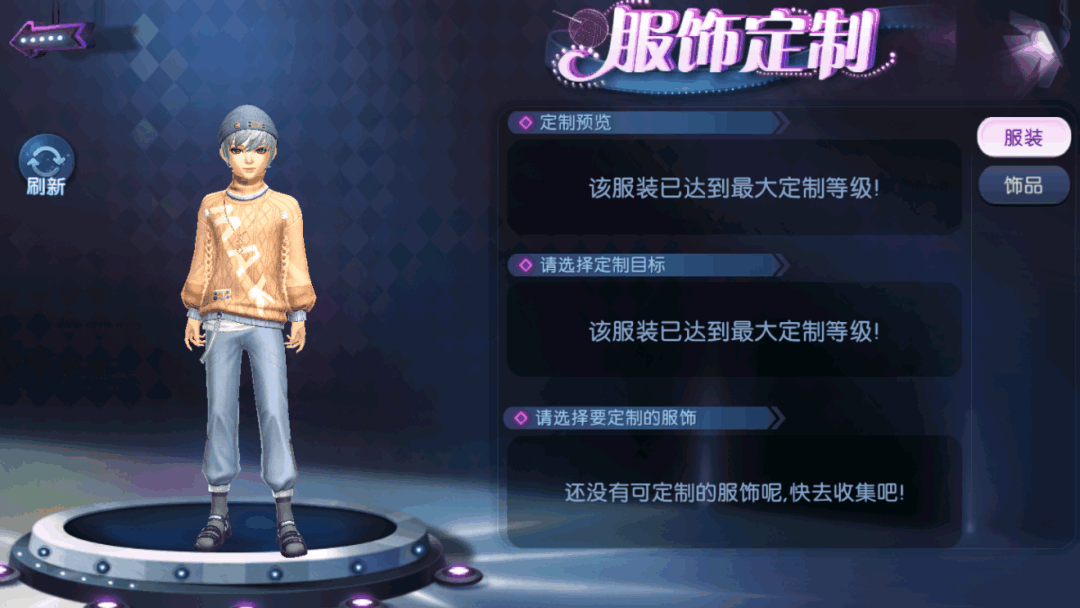 第三款上新的服饰为【明媚心情】,整体款式为小麦色的针织服饰穿搭,女款的清爽丸子头搭配灰白色的蝴蝶发箍,时尚休闲;内衬为高领露肩毛衣,外搭麦穗条纹的针织毛衫外套,不经意间透出的性感,俏丽多姿,做旧牛仔裤的年代感和手提包的搭配能为造型增色不少。