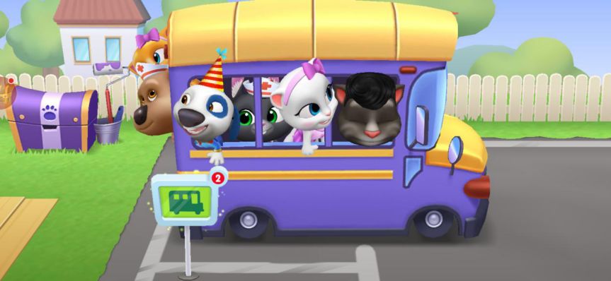《汤姆猫总动员》是“会说话的汤姆猫家族”IP下首款多角色养成游戏,六位家族成员搬进了一间大房子一起生活。游戏中有很多的互动和玩法,不光是角色和道具之间的交互,角色之间也会有社交需求。当角色显示需求时,点击气泡即可立即传送到对应位置,自行拖拽角色移动也可以达到相应的效果。而在所有场景里,几个角色会全部集中的地方,只有巴士和树屋。
