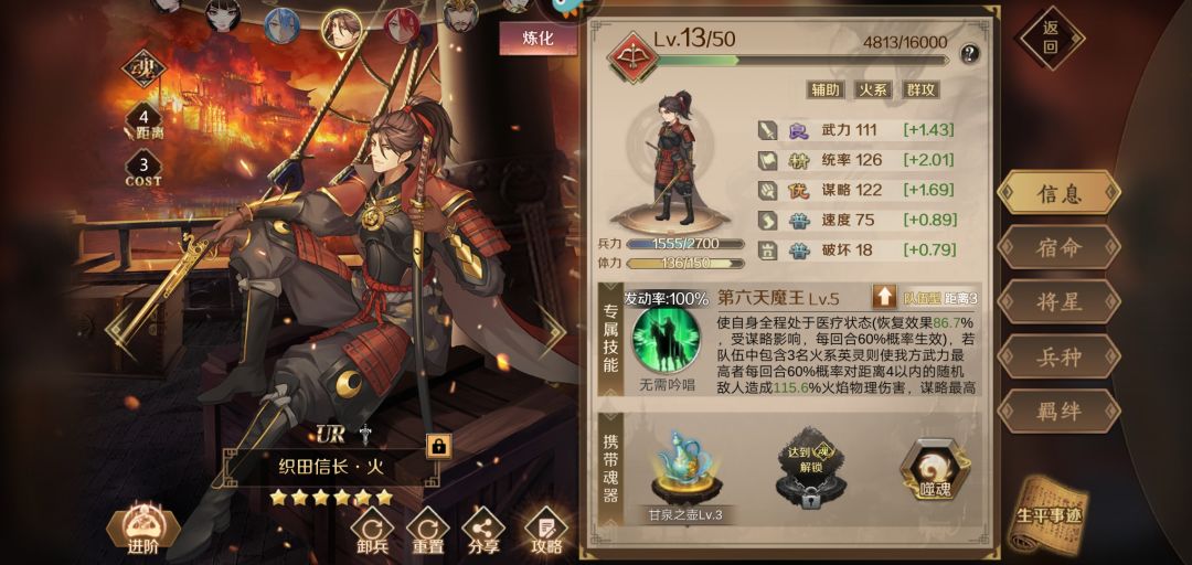 ,当然游戏中最主要还是靠的实力,粗看面板属性也不差,优秀的谋略,精湛的统帅这样的属性保证了他的硬度,在看技能,满级的情况下,60几率回复,60几率让最强的武力队友造成160的火伤,60几率让最强的谋略队友造成160的火法伤,这样算起来一回合就有320的伤害,如果运气好8回合触发那就无敌了,唯一比较难的就是需要上阵三个火属性英雄。但是我觉得称他最强辅助。不信你可以试试我最喜欢的英灵-织田信长