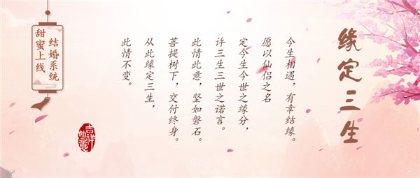 今生相遇,有幸结缘。愿以仙侣之名定今生今世之缘分,许三生三世之诺言。此情此意,坚如磐石。菩提树下,交付终身。从此缘定三生,此情不变。青云结婚系统,甜蜜上线,一起来看看结婚系统带来了哪些惊喜吧~