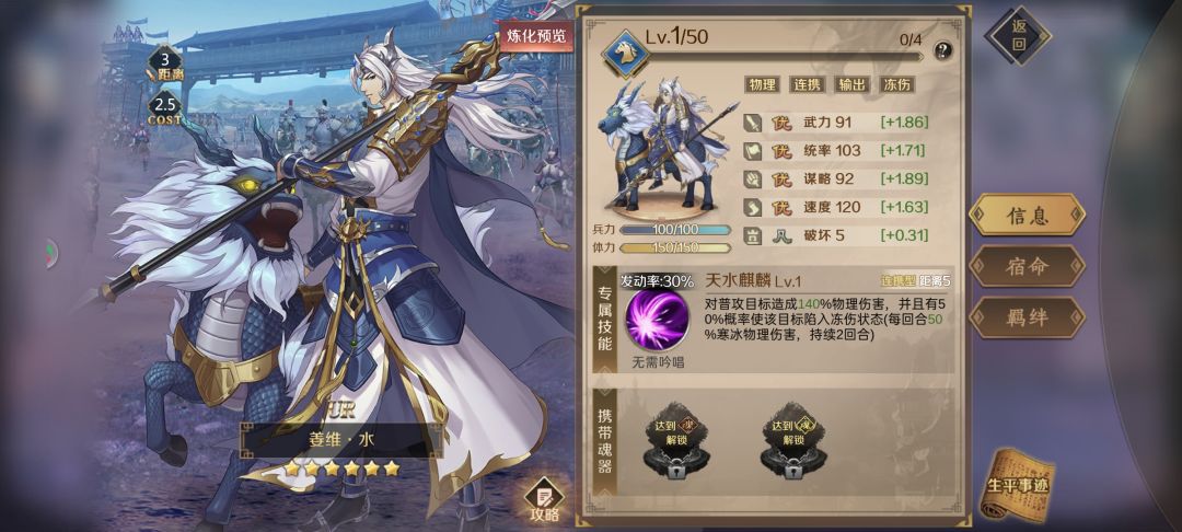 姜维字伯约,智勇足备,文武双全,又侍母至孝,心存汉室。曾为魏天水中郎,降蜀官至大将军。诸葛初向祁山取天水,维破其策又外设伏兵,败孔明。后降亮,献计取天水。维深得诸葛器重,亮授之平生所学。后随亮出祁山,维斩费耀,胜魏军。又取散关,破武都。及亮卒,维继诸葛之略,以攻代守。结羌人、断陇西,拓界厉兵,伺图中原,恢复汉室。乃会羌兵取南安,斩魏大将徐质,困司马于铁笼山,射杀都督郭淮,挫魏国之威。出狄道,背水大破王经,迁大将军。后段谷胡济失约维退败自贬后将军。奔长城,艾惧不与战。又祁山口识破邓艾混乱计,斗阵胜邓艾。将计就计诛诈降将王瓘,败邓艾丢盔弃甲,越山舍马。再出兵,侯和为艾破。黄浩弄权欲黜维,维避祸沓中,司马伺机兴师伐蜀,维守剑阁抵钟会,及后主降艾,敕维降,维乃佯降于会,策会反,图中原欲以杀会重扶汉室,乃事败,维及妻子皆伏诛。在全战天下里,充值满68就能拿到手,最好的开荒神将,魂器使用振奋号角,20级后再加个兵符,伤害非常高!是我最喜欢的英灵。