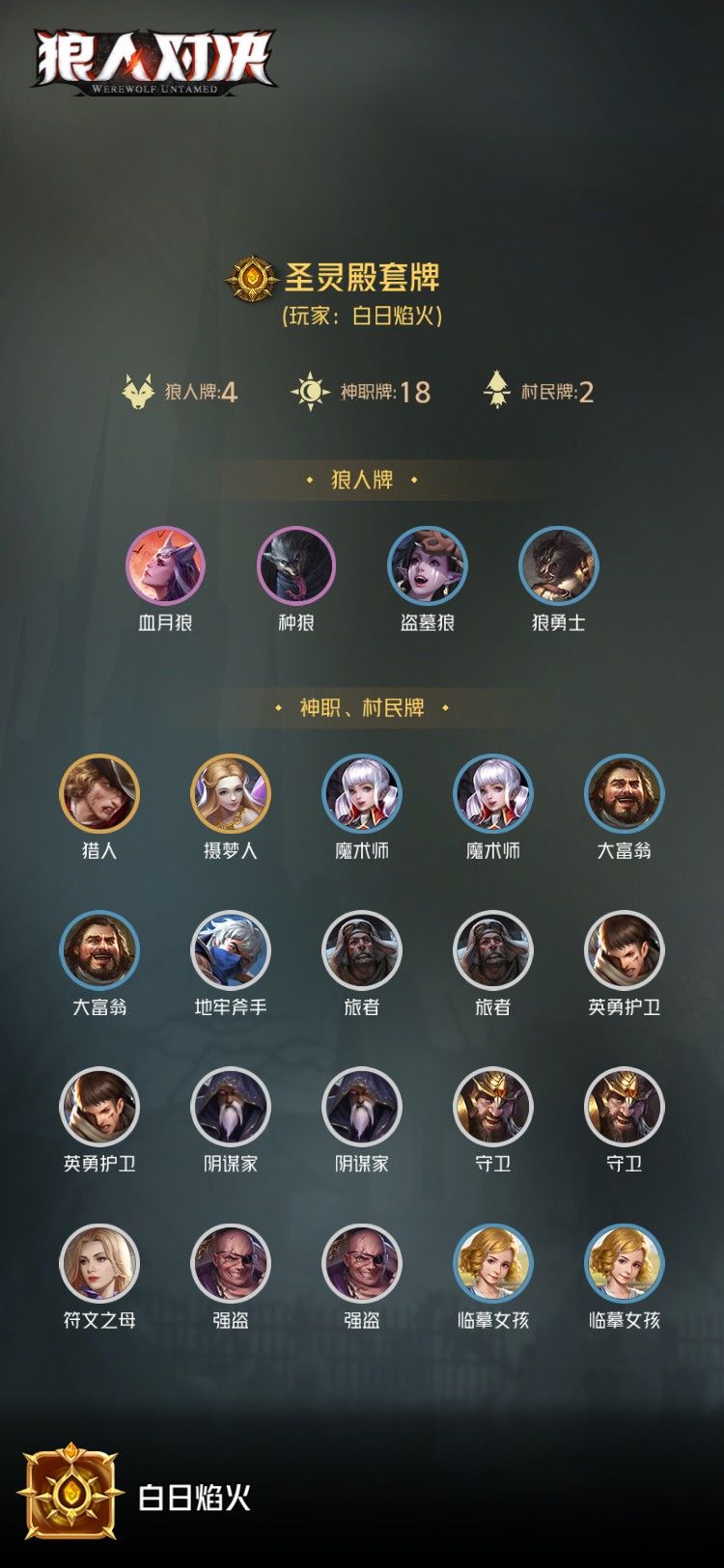 圣灵殿拥有额外的翻狼卡-阴谋家,可以在前中期依靠狼勇士拖慢对手节奏。需要利用好某一次后手给女孩贴膜然后藏起来。