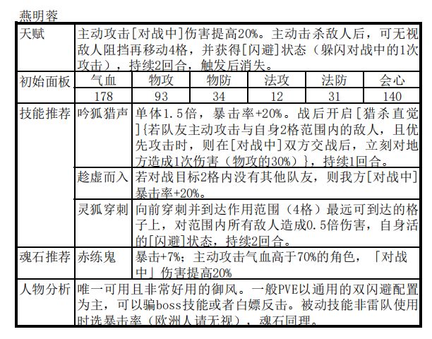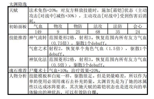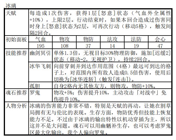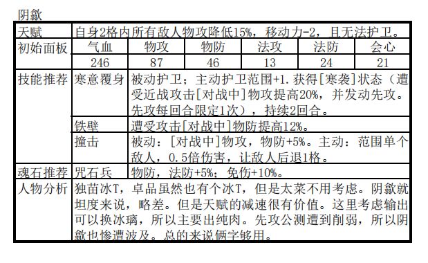 冰阵触发条件是封寒月+另外两个冰属性角色。所以首先确定另外两个冰属性角色非常必要。目前版本中,好用的冰属性角色相对较少,没什么选择余地。个人推荐为:封寒月+阴歙/冰璃,太渊隐逸。剩下的两个位置就是上火属性和雷属性输出扩大打击面,推荐角色为夏侯仪+燕明蓉。3冰角色中,阴歙和冰璃的主要区别就是一个T,一个无T输出。可以参考上篇中提到的鹿昭依和高戚的相互替换。