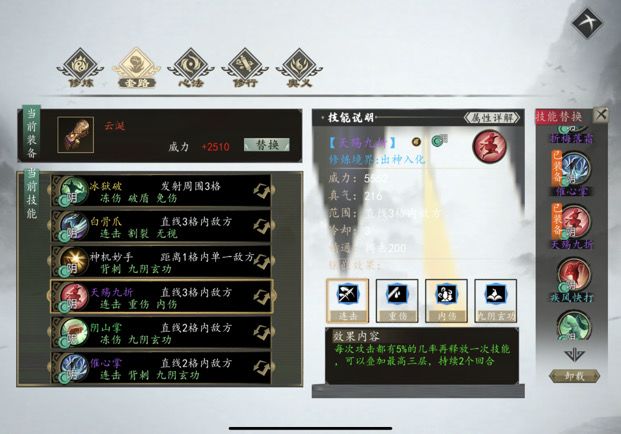 反观阴拳,虽然纸面上数据不高,一个白骨爪才5000 出头,就算凑了真九阴那个奥义也才七千,但是直线三格伤害,无视防御等等各种buff和暴击,基本上万血一下直接秒了。最爽的是,阴拳的核心功法都很靠前,一个九阴一个庄周北冥,都跟主线剧情没关系,前三章就能拿。套路用新手村抓小偷的神机妙手和杭州的天殇九折过渡,一个cd短伤害高(前期阴属性没上去的时候比九阴的技能伤害还高,一个伤害高的aoe,带破盾带重伤,基本上拿这俩心法不成问题。
