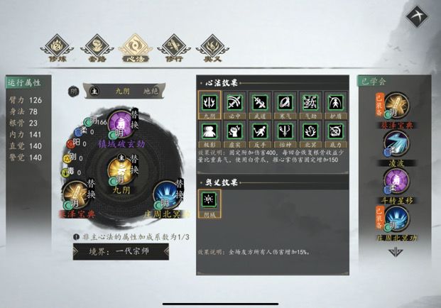 因为皇帝线好像没有蓉城剑圣秘藏的情节,拿不到万象森罗,我就老老实实堆阴属性了,九阴庄周肯定必用,剩下俩我学的葵泽和镇域破玄,葵泽中规中矩吧,四维属性,阴属性,被动都挺万金油的,而且根骨相对来说高一点,那俩根骨都是个位数。拿镇域破玄也是为了凑阴属性,而且他那个被动也不错,就是这个紫色的品质让我犹豫了一下,但是我找了一圈好像也没有更好的了。
