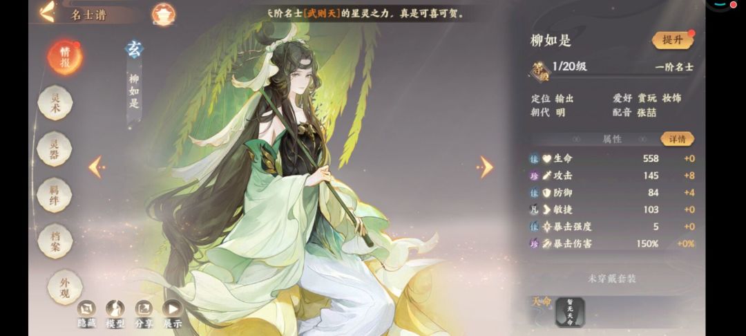 名士柳如是攻击、暴击伤害为“珍”级别,生命,防御和暴击强度为“佳”级别,敏捷为“凡”级别,定位为输出,各项属性成长还是非常不错的。