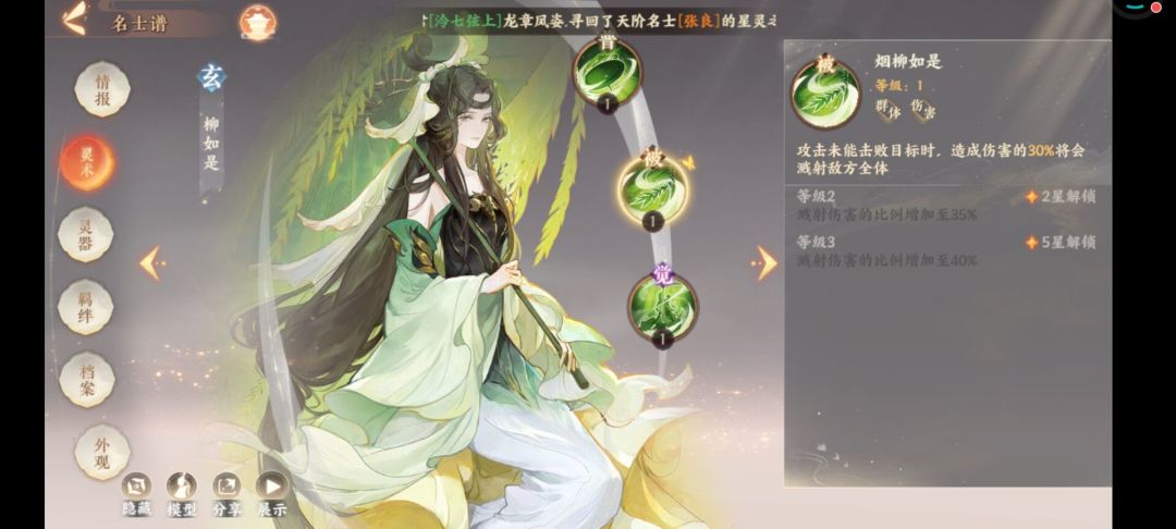 第二个灵术被动技能“烟柳如是”:攻击未能击败目标时,造成伤害的30%将会溅射敌方全体。升至5星后解锁溅射伤害的比例增加至40%。这项技能简直是神技了!直接从单体攻击变成了全体攻击,这输出肯定妥妥的!在人间是人见人爱的秦淮名妓,在忘川作为一名输出型名士,是单点秒杀,也是输出担当,柳如是在忘川绝对会成为使君们的爱宠。