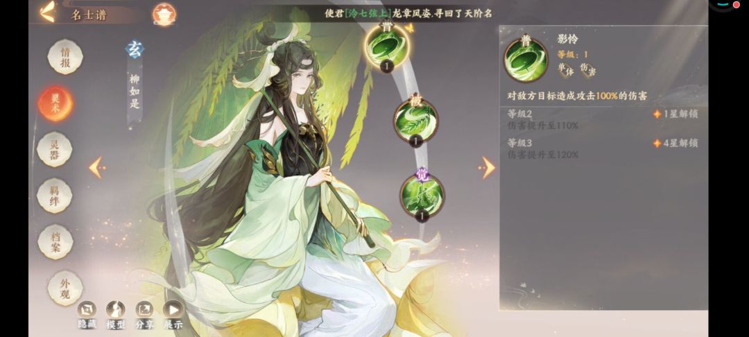 第一个灵术普攻技能“影怜”:对敌方目标造成攻击100%的伤害,升至四星后解锁:伤害提升至120%。作为一个自幼孤苦的天涯伶人,柳如是常顾影自怜,看到自己的影子,想到自己的遭遇,怜惜起自己。但不管身世如何,柳如是常常与张溥,陈子龙等铮铮铁骨的民族志士来往,纵论天下兴亡。柳如是曾对张溥说:“中原鼎沸,正需大英雄出而戡乱御侮,应如谢东山运筹却敌,不可如陶靖节亮节高风。如我身为男子,必当救亡图存,以身报国!