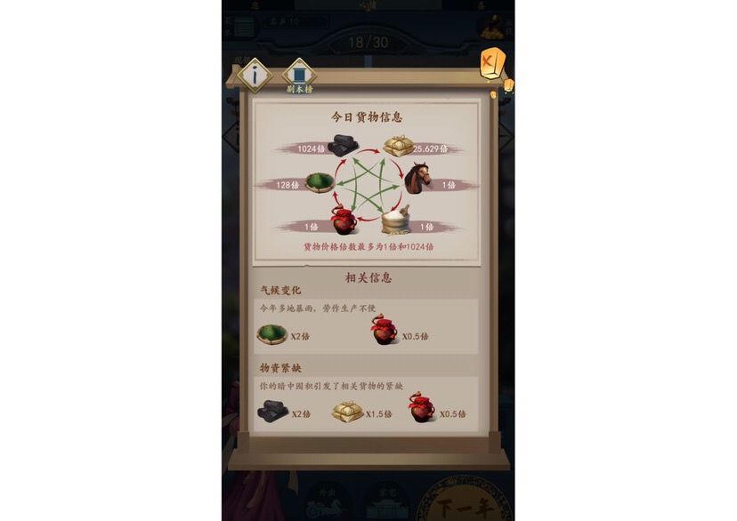 该剧本中,老板将以独特开局事件开局,拥有独特的囤积系统和气候事件,每当老板们进入下一年时,若有货物占仓库数量一半以上,该货物以及部分相关货物的市价会发生变化,也就是说,老板们可通过主动囤积货物,营造物资紧缺的假象,来影响商品的价格,同时,每年还会随机出现气候、灾难事件,如战乱导致马匹的价格暴涨等,老板们可合理利用,待到某样商品价格足够高时,将囤积的商品卖出,获得暴利,但需要注意的是,法网恢恢疏而不漏,当倒卖的商品价格过分高的时候,是会被官府发现而斩首的,所以不要无脑的囤积,要试着在合适的时机脱手,金盆洗手(然后再去炒新商品的价格)所以在这个买卖货物的年代里,你最适合做的就是开局屯煤炭(听说开局买的煤炭必涨!),所以接着就是屯货之路咯~紧接着你要看到跌的你就先买,等到差不多数十亿的时候一定要先开房子,但最后一个房子不要开(技能:仓库数量翻倍),接着先买烈酒、首饰、瓷器什么的,让自己财产上千万,然后疯狂买马,没错,就是疯狂买马,开仓库买马,开房子买马,看视频买马只要你这么做了,你基本就赢了。但还有意外,这时候你要注意看右上角的买卖提示,要是看到马的价格是乘以0.5倍的话,你要适当卖马,因为涨的太慢了,毕竟在这个模式中买什么都容易暴富,你可以算一下茶叶乘以3480倍的价格,这也足以暴富,所以每局都要看自己的形式,切记不要贪某一个利润高的东西,这样往往会适得其反!