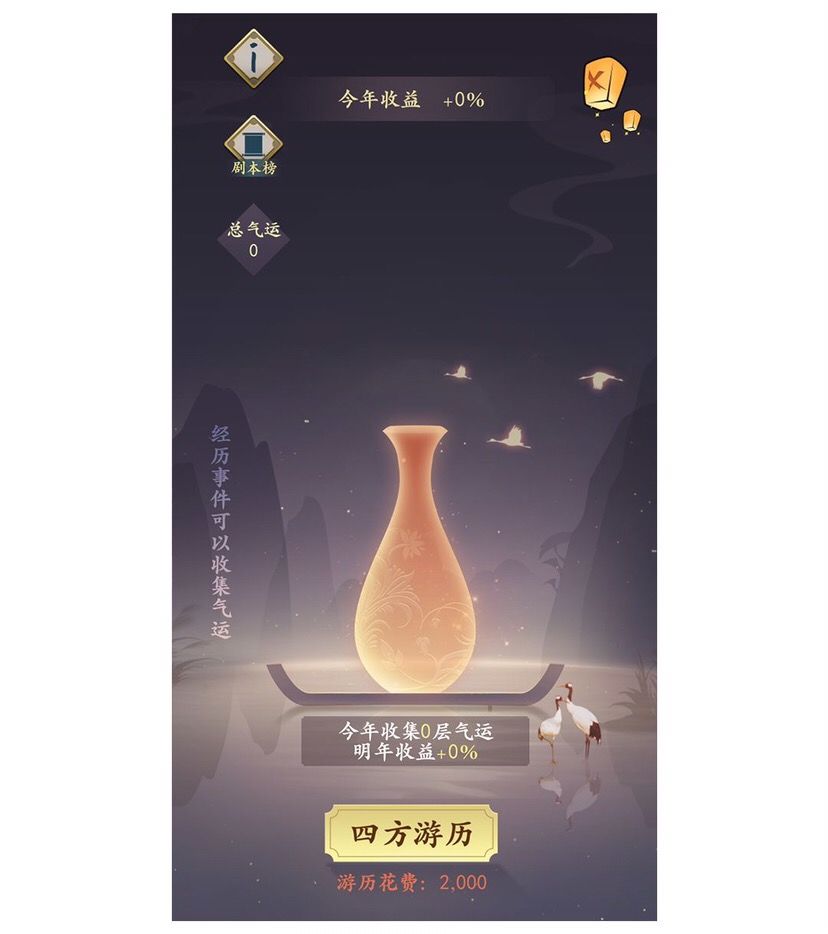 同时还可花费金钱游历,主动触发事件,每局人生的比拼目标不再是资金,而是结束时累计的总气运,所以在游戏中,你可以花费一定的钱来获得气运,毕竟人死了钱还没花完是很悲催的鸭!!~