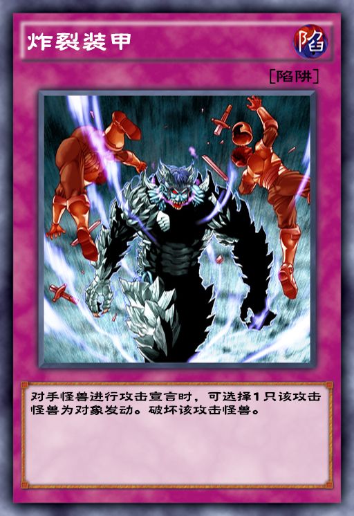 超凡-炸裂装甲:攻宣1换1,坑与怪物紧密配合的时代成为过去,解前场踢脸不再安全;与【银幕的镜壁】相比各有利弊,缺点在于取对象\破坏效果会被诸如【阳炎兽】抗性免疫,优点就是刚才提到的无需怪物配合。