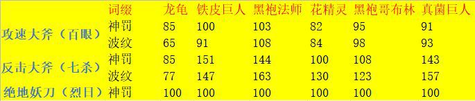 这张表是以绝地妖刀的输出作为基准值,也就是100%的情况下 用相同等级 同样5红的大斧打相同的怪采样的。
