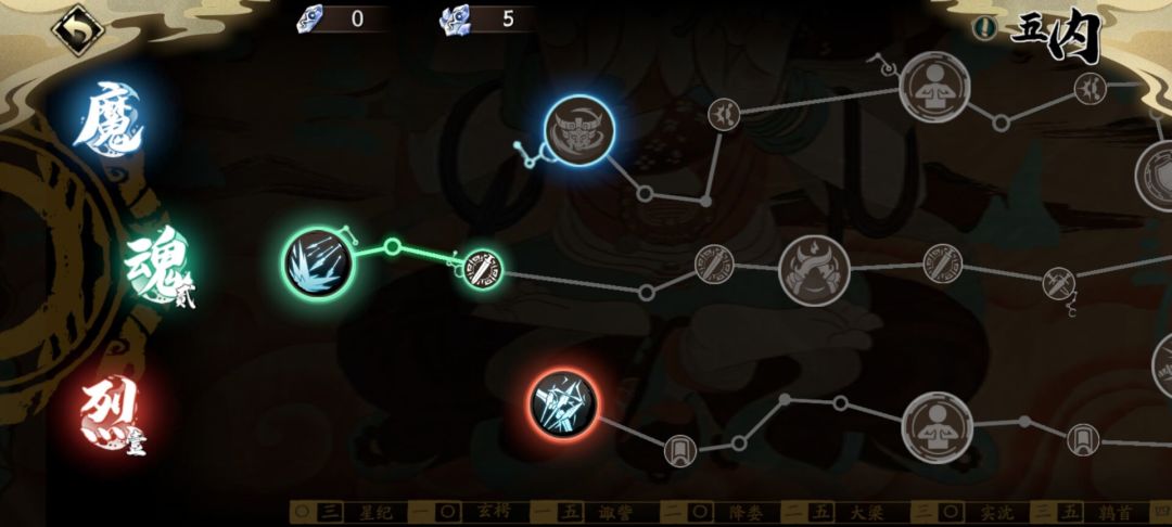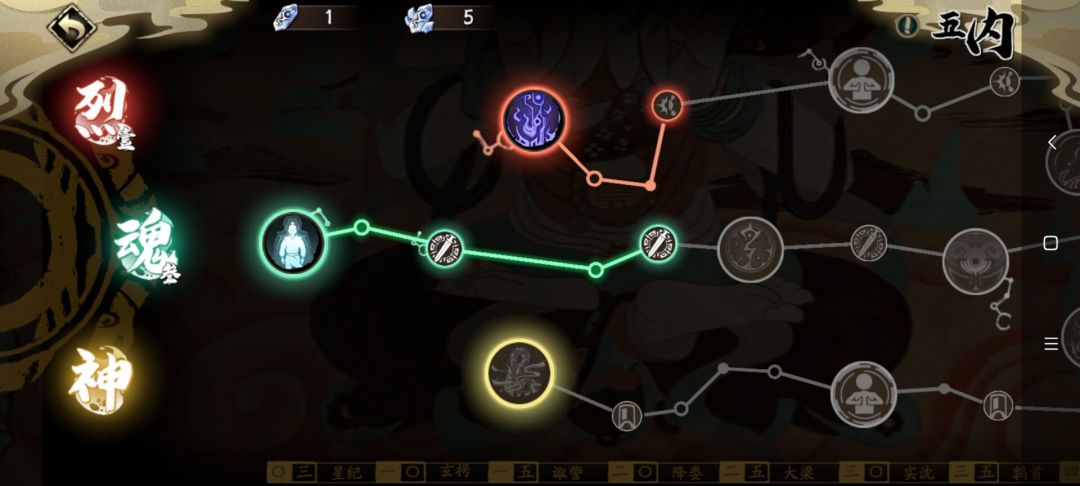 主点中路【魂】,副点下路【烈】拿到第一个单体技能【疾风卷尘】。点上路【魔】虽然加更多会心值,但没有任何主动技能可拿,且不适合浪费太多资源给极品英灵走双线。