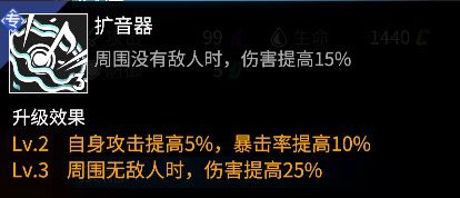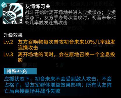 作为火力职业,初音未来具有火力专属的职业被动,周围没有敌人时,伤害提高;因为初音未来战斗开始后就会离开场地,身边永远不可能存在敌人,该效果可稳定生效。专属中额外提供的攻击和暴击,对于无须担心生存问题的初音未来来说可谓量身定制。