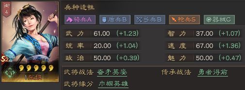 适性基本只有S枪可以玩,最关键的是这个武将的统率实在太低了,同时武力值也很低,当然武力值可以靠自己的战法有一定程度的弥补,但基本上要到4回合左右才能把武力提升到一个输出武将该有的正常水平(某种程度上可以全统率加点,但即使加了也依旧是最脆皮的武将之一,该扛不住还是扛不住,同时武力还更低了,S适性、阵营等的加成也会更低,个人还是建议全武力加点)。