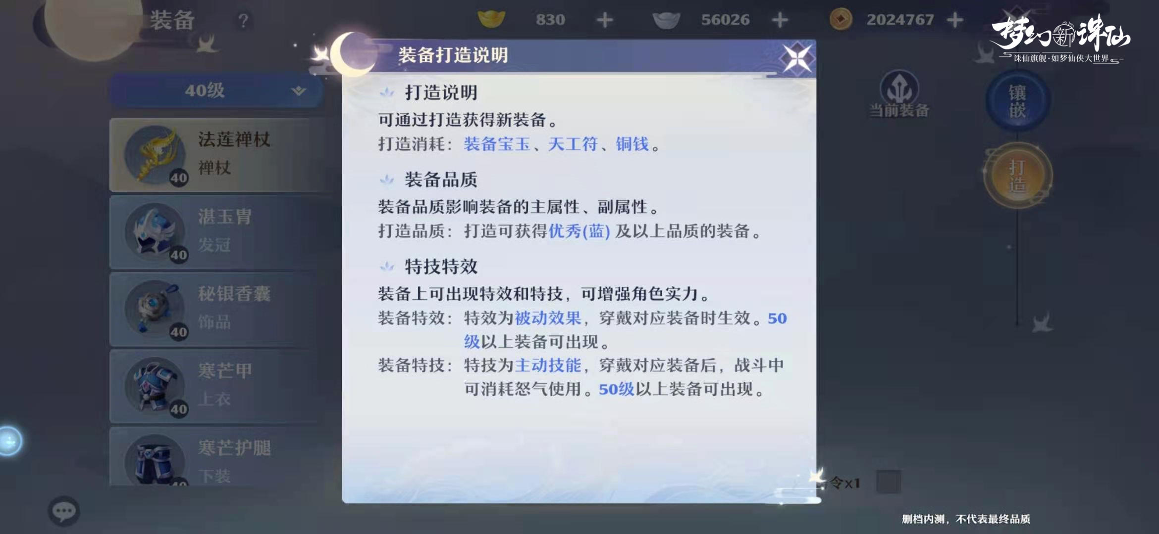 仙友可打造出的装备根据品质颜色分为:红>橙>紫>蓝(绿色品质装备可在各大商人处购买),其中装备品质越高,主属性、副属性的数值也就越高,而当打造出的红、橙装备等级≥50级时,将有概率获得特效(被动)装备和特技(主动)装备。