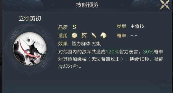 曹丕的主将技能为“立颂黄初”,是一项既有伤害又有控制效果的群体减益技能,施放时,能对范围内的敌人造成120%的智力伤害,同时又有30%的几率使其处于缴械状态。这项技能还是非常强力的,既有高额的群体爆发伤害,又能实现控场效果,非常适合用来对付敌方的连击队。