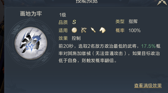 曹丕的专属武将技能为“画地为牢”,同样是强力的控制型技能。释放后,会随机选取两名地方政治属性最低的敌人,有35的概率使其处于缴械状态,而且,如果目标政治属性低于曹丕自身,缴械的触发概率还会翻倍。而前面我们介绍过,曹丕是少有的政治属性近200的武将,所以该技能的实际触发几率还是非常高的。