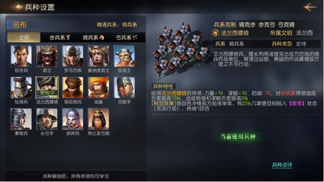 法兰西的初始设定与不列颠完全不同,法兰西更倾向部队发展,而不列颠倾向于城市建设。与文明特点相同的是法兰西的特色兵种,在解锁特色兵种“法兰西骠骑”后,统领该兵种的将领可直接获得额外的10点力量与谋略,对步兵系将领的伤害提高15%,造成的谋略伤害与物理伤害提高5%,在首回合时还会发动冲锋,有25%的几率使敌方前排陷入【震慑】(无法行动),在获得这一系列效果的同时会使自身防御降低10点,名副其实的战斗机器。