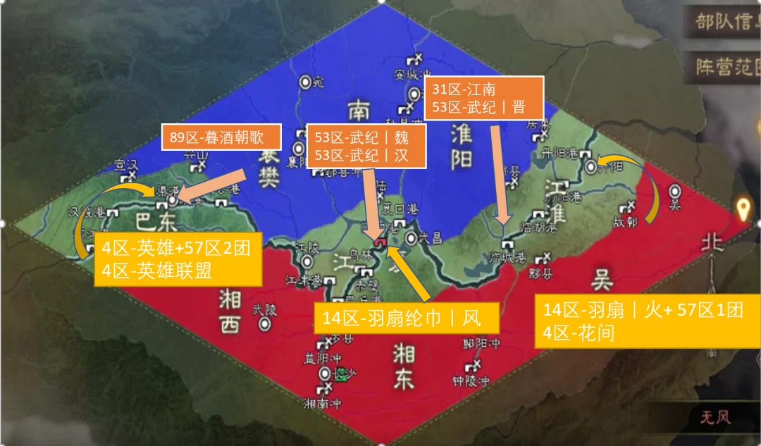 此时我们S5从42区招募的西游团长 橙丨金角大王找到菊花盟主和烨军师,提议由西游团做基础,临时突击对面整个防御链条最弱的一环。为防细作泄密,只在奇袭之前一刻钟内飞鸽通知附近的将士一起冲击,这样即使曹魏探到情报,也无法在短时间及时响应布防。