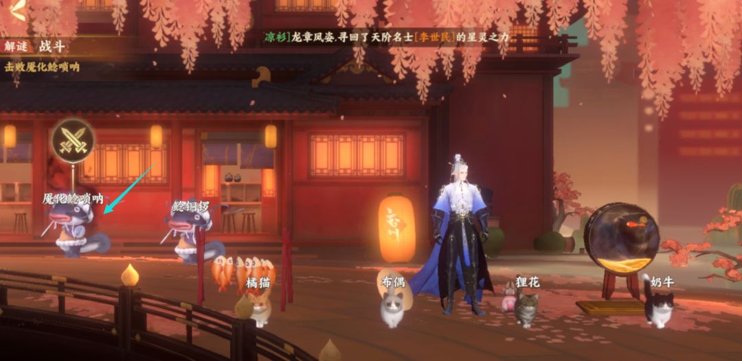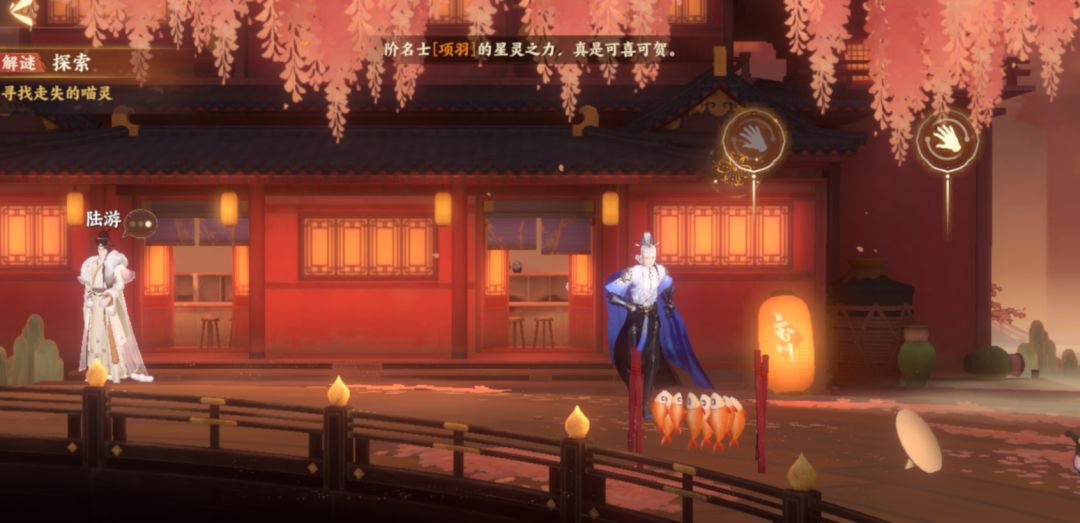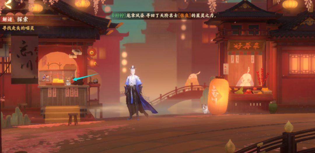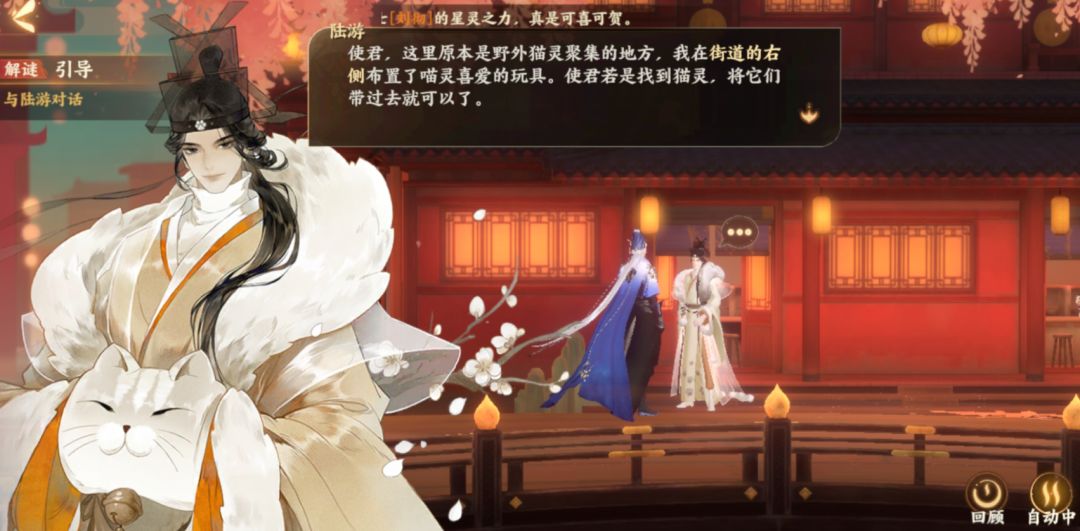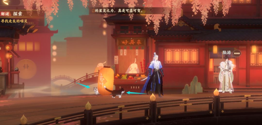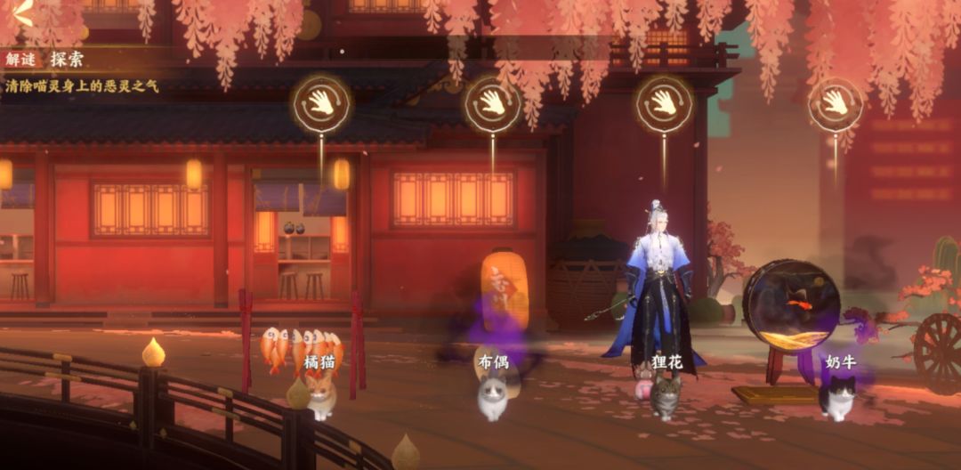 陆游表示这里便是野外猫灵聚集的地方,在街道的右边有一些猫灵喜欢的玩具,如果碰见不同种类的猫灵,便将它们带到不同的玩具上即可。不过,猫灵也是有个性的,如果使君将猫灵带到它们不喜欢的地方,猫灵则会傲娇的转身离开哦。